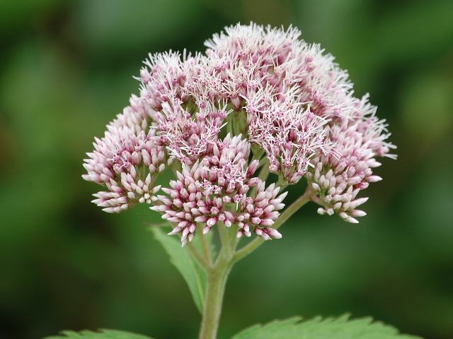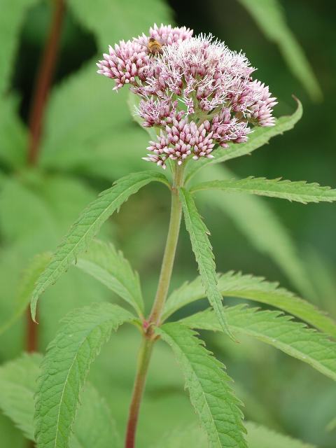 四葉鵯(ヨツバヒヨドリ) 夏の花 2011年08月05日 四葉鵯(ヨツバヒヨドリ)はキク科フジバカマ属の多年草である。北海道から本州の近畿地方にかけて分布し、湿った道ばたや林の中に生える。海外では、サハリンにも分布する。草丈は1メートルくらいである。同属の藤袴(フジバカマ)や鵯花(ヒヨドリバナ)と花の形はよく似ているが、葉の特徴で見分けられる。四葉鵯(ヨツバヒヨドリ)は名の通り4枚の葉が輪生する。ただし葉の数は3枚だったり5枚だったりする。葉の形は細長い楕円形である。これに対して藤袴(フジバカマ)の葉は3裂し、鵯花(ヒヨドリバナ)の葉は裂けずに向かい合って生える(対生)。開花時期は7~9月である。キク科の花らしく筒状花が集まって咲く。花の色は淡い紅紫色である。筒状花の先は5つに裂け、糸のような花柱(雌しべ)が突き出す。花の後にできる実はそう果(熟しても裂開せず、種子は1つで全体が種子のように見えるもの)である。属名の Eupatorium は小アジアのポントス王「Eupator」の名にちなむ。この属のある植物を薬用にしたことから名づけられた。種小名の chinense は「中国の」という意味である。変種名の sachalinense は「サハリンの」という意味である。写真は7月に北海道の弟子屈町で撮った。学名:Eupatorium chinense var. sachalinense★芳しき蜜の香りはいかばかり 蝶を集めて四葉鵯花図鑑植物図鑑