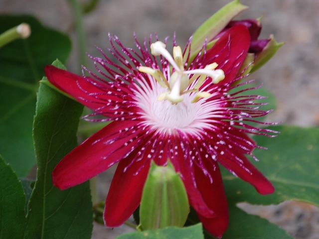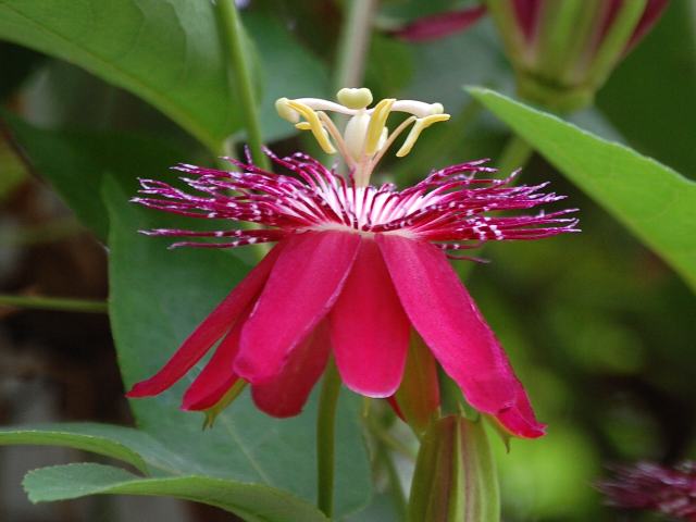 紅花時計草(ベニバナトケイソウ) 夏の花 2011年08月08日 紅花時計草(ベニバナトケイソウ)はトケイソウ科トケイソウ属の多年草である。原産地はベネズエラ、ボリビアである。日本では温室で栽培されるが、沖縄では露地植えされている。蔓性で他のものに絡まって伸びる。草丈は3~6メートルくらいになる。茎や葉には毛が生えている。葉は長い楕円形で、互い違いに生える(互生)。葉は肉厚な革質で、縁には粗いぎざぎざ(鋸歯)がある。開花時期は7~8月だが、温度さえ合えば通年開花をする。茎先に近い葉の脇から柄を出し、濃い紅色の花を1輪ずつつける。花は一日花だが、次々と開花する。花弁が10枚あるように見えるが、花弁5枚と萼片5枚からなる。真ん中にある鬚のようなものは副花冠である。副花冠も濃い紅色で、つけ根の部分は白くなっている。花の後にできる実は液果(果皮が肉質で液汁が多い実)である。「時計草」の由来は、花の形を時計の文字盤に見立てたものである。英名はレッドパッションフラワー(red passion flower)である。この場合のパッションは「受難」を意味する。花の形をキリストの十字架に見立てたものである。属名の Passiflora はラテン語の「flor della passione(情熱の花)」からきている。雌しべの柱頭をはりつけにされたキリストにたとえ、放射状の副花冠をキリストの後光にたとえた。種小名の coccinea は「赤い」という意味である。写真は7月に水戸市植物公園で撮った。学名:Passiflora coccinea★刻むなら深紅の時を刻みたい 惜しんでみても一夜の命花図鑑植物図鑑