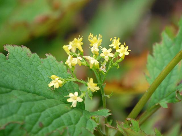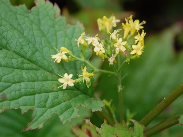 丸葉金鈴花(マルバキンレイカ) 夏の花 2011年08月09日 丸葉金鈴花(マルバキンレイカ)はオミナエシ科オミナエシ属の多年草である。北方領土を含む北海道から本州の新潟県にかけて分布し、山地の斜面や岩場に生える。草丈は30~70センチくらいである。葉は幅の広い卵形で、向かい合って生える(対生)。葉の先は鋭く尖り、縁は羽状に浅く裂けてぎざぎざ(鋸歯)がある。葉の柄には翼がある。開花時期は7~8月である。茎先に集散花序(最初の花が枝先につき、その下に次々と側枝を出して花がつく)を出し、黄色い小さな花をたくさんつける。花径は4~5ミリで、花冠の先は5つに深く裂ける。花冠のつけ根の部分には半円形の小さな距(花冠のつけ根が後ろに飛び出たもの)がある。雄しべは4本で、花冠から突き出る。雌しべは1本である。花の後にできる実はそう果(熟しても裂開せず、種子は1つで全体が種子のように見えるもの)である。属名の Patrinia はフランスの植物採集家「パトラン(E. L. M. Patrin)さん」の名からきている。種小名の gibbosa は「瘤のある」という意味である。写真は9月に北大植物園で撮った。学名:Patrinia gibbosa★星屑を散らすがごとく鮮やかに あたりを照らす丸葉金鈴花花図鑑植物図鑑PR