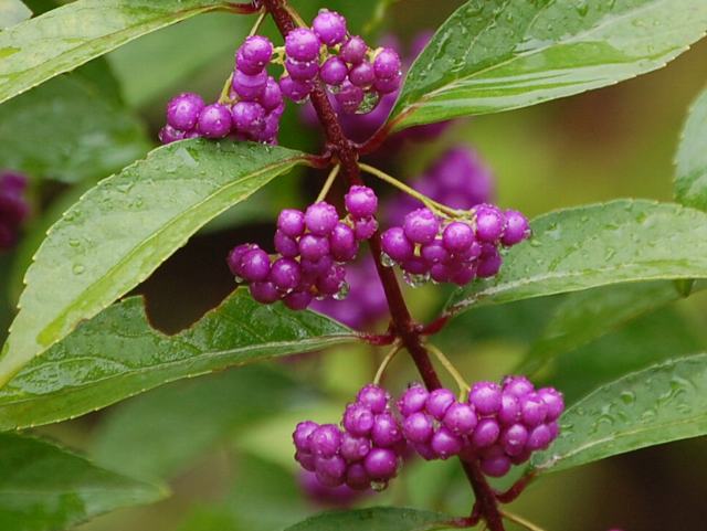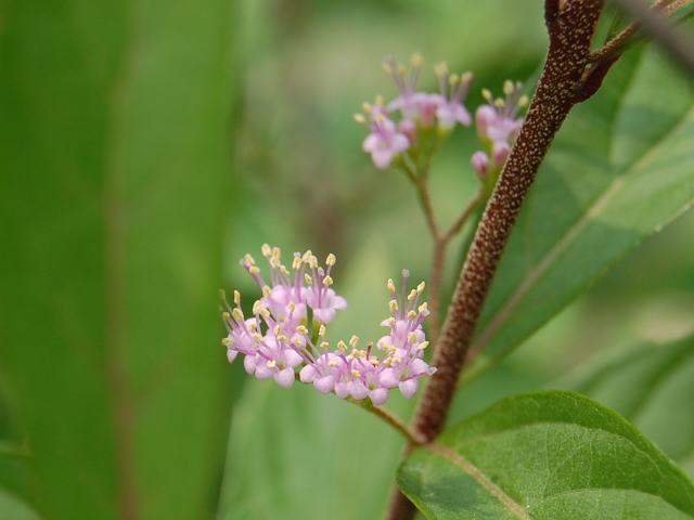 小紫(コムラサキ) 夏の花 2011年06月20日 小紫(コムラサキ)はクマツヅラ科ムラサキシキブ属の落葉低木である。別名を小式部(コシキブ)ともいう。いずれも「紫式部」にちなむ名である。本州の岩手県から沖縄にかけて分布し、山地や湿地に生える。また、庭木ともする。海外では、朝鮮半島や中国にも分布する。園芸的には紫式部の名で流通することもあるが、植物上の紫式部(ムラサキシキブ)は別種である。和名の由来は、秋に小さな紫色の実をつけるところからきている。樹高は2~3メートルである。葉は楕円形で、向かい合って生える(対生)。葉の縁には、先のほうの半分くらいに細かなぎざぎざ(鋸歯)がある。開花時期は6~8月である。葉の脇に集散花序(最初の花が枝先につき、その下に次々と側枝を出して花がつく)を出し、淡い紫色の小さな花をたくさんつける。花は筒状で先が4つに裂けて平らに開く。雄しべは4本、雌しべは1本で、花冠から飛び出る。紫式部(ムラサキシキブ)に比べると、花も実も葉の柄のつけ根から少し離れた位置から出る。花の後にできる実は核果(水分を多く含み中に種が1つある)である。結実期は9~11月である。直径3ミリくらいの紫色の実をつける。実は紫式部(ムラサキシキブ)よりも小振りだが、鞠のように固まってつく。実の色が白いものもあり、白玉小式部(シラタマコシキブ)ないし白実の小紫(シロミノコムラサキ)と呼ばれる。属名の Callicarpa はギリシャ語の「callos(美しい)+carpos(果実)」からきている。実が美しく熟すからことから名づけられたものである。種小名の dichotoma は「二股になった」という意味である。写真は6月に小石川植物園で撮った。実の写真は10月に小石川植物園で撮った。学名:Callicarpa dichotoma★紫の珠と実らんいつの日か 揺れる小花は陽射しを浴びて花図鑑植物図鑑