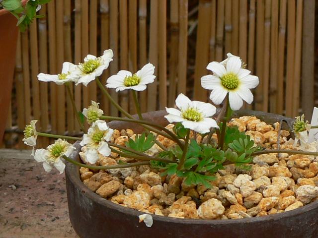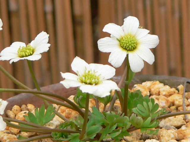 日高草(ヒダカソウ) 夏の花 2011年06月21日 日高草(ヒダカソウ)はキンポウゲ科キタダケソウ属の多年草である。北海道の固有種である。北海道日高地方のアポイ岳とその周辺だけに分布し、高山帯の蛇紋岩地や凝灰岩地に生える。「氷河期の生き残り」と言われている。環境省のレッドデータブック(2007)では、「ごく近い将来における絶滅の危険性が極めて高い種」である絶滅危惧IA類(CR)に登録されている。アポイ岳は固有種などが多いことで知られる貴重な山だが、温暖化の影響などでハイマツが優勢になり、お花畑の縮小化が進んでいるため保護対策が求められているという。草丈は10~20センチくらいである。葉は2回3出複葉である。3出複葉というのは、1枚の葉が3つの小さな葉に分かれた形を指す。それが2回枝分かれを繰り返す。小葉はさらに細かく裂ける。自生地での開花時期は5~6月である。葉に先立って、花径2センチくらいの白い花を咲かせる。花びらは10枚くらいあり、花びらの根元近くには赤褐色の斑紋がある。花の後にできる実はそう果(熟しても裂開せず、種子は1つで全体が種子のように見えるもの)である。属名の Callianthemum はギリシャ語の「 callos(美)+anthemon(花)」からきている。種小名の miyabeanum は北海道の植物研究者「宮部金吾さんの」という意味である。写真は3月に神奈川県立フラワーセンター大船植物園で撮った。学名:Callianthemum miyabeanum★生き残り太古のロマン語り継ぐ 日高草をば守り伝えん花図鑑植物図鑑