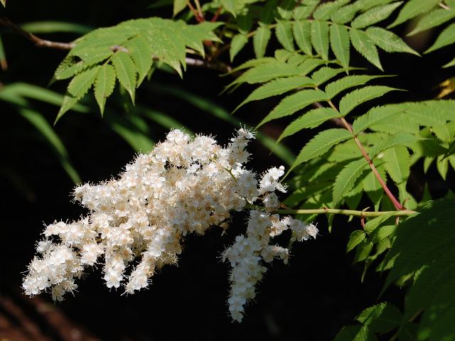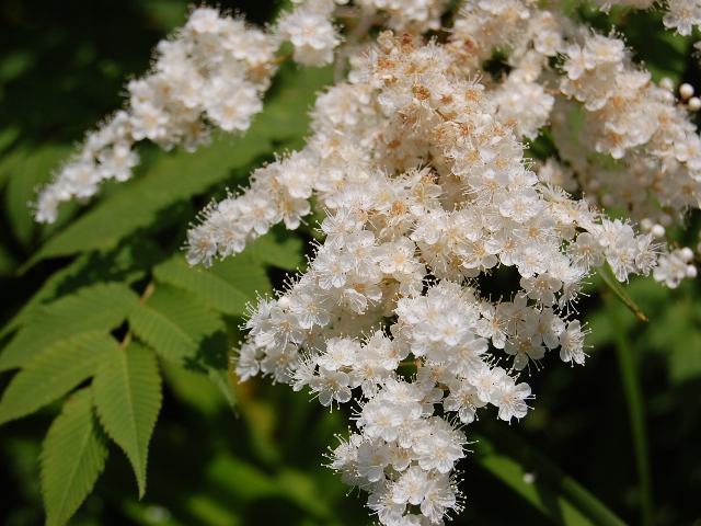 庭七竈(ニワナナカマド) 夏の花 2011年06月22日 庭七竈(ニワナナカマド)はバラ科ホザキナナカマド属の落葉低木である。原産地は中国の北部である。別名を珍至梅(チンシバイ)という。樹高は3~4メートルである。樹形は株立ちになる。葉は奇数羽状複葉(鳥の羽のように左右に小葉がいくつか並び、先に1つの小葉がついて1枚の葉が構成される)で、互い違いに生える(互生)。小葉の形は披針形である。近縁種の穂咲き七竈(ホザキナナカマド)と比べ、葉先が尾状に尖る点が異なる。葉の縁には重鋸歯(大きなぎざぎざに更に細かなぎざぎざがある)がある。開花時期は6~8月くらいである。枝先に円錐花序(枝分かれして全体が円錐状に見える)を出し、白い小さな花をたくさんつける。花径は5~7ミリくらいで、花弁は5枚である。萼片は5枚で反り返る。雄しべは20本である。柱頭(雌しべの先端で花粉の付着する部分)は5つに裂ける。花の後にできる実は円柱形の袋果(熟すと果皮が自然に裂けて種子を放出する)である。属名の Sorbaria は属名の「Sorbus(ナナカマド属)」からきている。葉が似ていることから名づけられた。種小名の kirilowii は採集家「キリロフの」という意味である。写真は6月に神奈川県立フラワーセンター大船植物園で撮った。学名:Sorbaria kirilowii★びっしりとつけた白花可愛いよ 北の地に咲く庭七竈花図鑑植物図鑑
