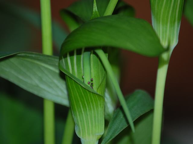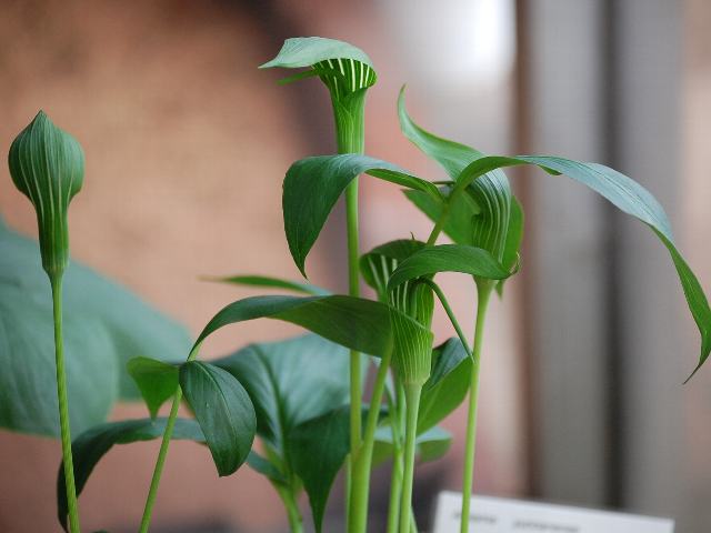 アリサエマ・ユンナネンセ 夏の花 2011年06月23日 アリサエマ・ユンナネンセはサトイモ科テンナンショウ属の多年草である。原産地は中国(雲南、四川、貴州)、タイ、ミャンマー、ベトナムである。草丈は60センチくらいである。葉は普通は3小葉に分かれる。開花時期は6月から7月である。仏炎苞(棒状の花を包み込む苞を仏像の背景にある炎形の飾りに見立てたもの)は緑色で、黄緑色のストライブが入る。肉穂花序(花軸が多肉化して花が表面に密生したもの)は仏炎苞から突き出る。花の後にできる実は液果(果皮が肉質で液汁が多い実)の集合果である。属名の Arisaema はギリシャ語の「aris(植物名の1つ)+haima(血)」からきている。血のような斑点が葉にある植物といった意味合いになる。種小名の yunnanense は「雲南省の」という意味である。写真は6月に神奈川県立フラワーセンター大船植物園で撮った。学名:Arisaema yunnanense★美しく飾るが如きストライブ 烏柄杓を思わすようで花図鑑植物図鑑