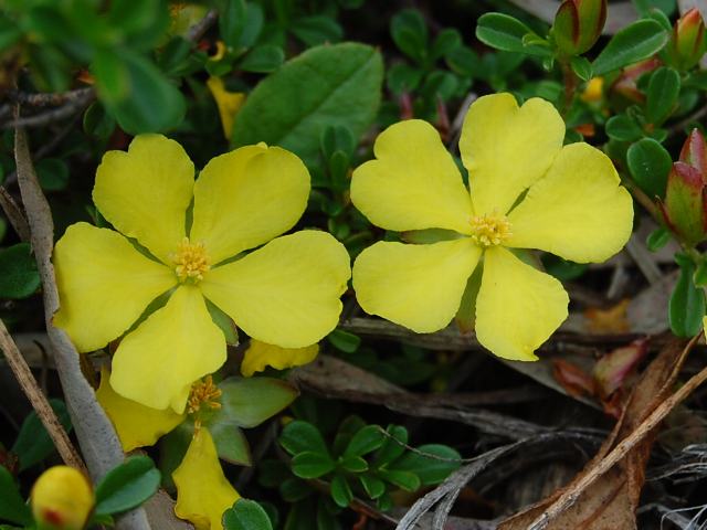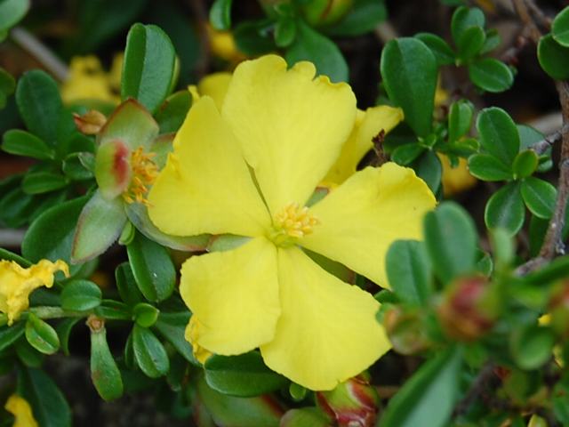 ヒベルティア・セルピリフォリア 夏の花 2011年06月24日 ヒベルティア・セルピリフォリアはビワモドキ科ヒベルティア属の常緑蔓性低木である。原産地はオーストラリアである。南東部のニューサウスウェールズ州、ビクトリア州、タスマニア州に分布し、荒れ地や砂地に生える。樹高は1メートルくらいである。地面を這って広がる。葉は長さ1センチくらいのへら形で分厚い。開花時期は2月から6月くらいである。花径2~3センチの黄色い花を次々とつける。花弁は5枚である。萼には毛がたくさん生えている。属名の Hibbertia はイギリス人の商人で後援者の「ヒバート(G. Hibbert)さん」の名からきている。種小名の serpyllifolia は「イブキジャコウソウのような葉の」という意味である。写真は6月に神奈川県立フラワーセンター大船植物園で撮った。学名:Hibbertia serpyllifolia★この花もオーストラリアが故里だ 地を這うように花を咲かせて花図鑑植物図鑑PR