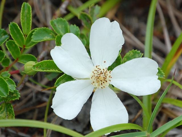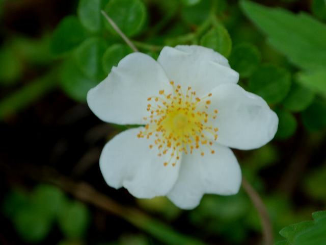 照葉野茨(テリハノイバラ) 夏の花 2011年06月10日 照葉野茨(テリハノイバラ)はバラ科バラ属の落葉低木である。福島県以南の本州から沖縄にかけて分布し、日当たりのよい山野、川原、海岸などに生える。海外では、朝鮮半島、中国にも分布する。野茨(ノイバラ)によく似ているが、葉が厚くて艶があり、無毛であるなどの違いがある。また野茨(ノイバラ)の茎は立つが、照葉野茨(テリハノイバラ)は地を這って伸びる。樹高は20~50センチくらいである。葉は奇数羽状複葉(鳥の羽のように左右に小葉がいくつか並び、先に1つの小葉がついて1枚の葉が構成される)で、互い違いに生える(互生)。小葉の形は楕円形ないし幅の広い卵形である。 先は尖り、縁にはぎざぎざ(鋸歯)がある。葉には艶があり、毛は生えていない。開花時期は5~7月である。枝先に総状花序(柄のある花が花茎に均等につく)を出し、次々に開く。花の色は白ないし淡いピンクである。花径は2~3センチぐらいである。花びら(花弁)は5枚ある。花の真ん中には黄色い雄しべがたくさんある。花の後にできる実は偽果(子房以外の部分が加わってできている果実)である。属名の Rosa はケルト語の「rhodd(赤色)」からきている。種小名の wichuraiana はドイツ人の植物採集家「ウィチュラ(M. E. Wichura)さんの」という意味である。写真は7月に国営ひたち海浜公園で撮った。学名:Rosa wichuraiana★真っ白な花が目立つよ葉っぱもね 照り輝いて命を謳い花図鑑今日の花ドットコム