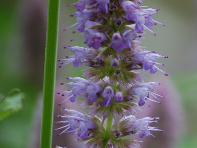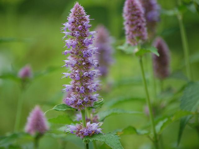 川緑(カワミドリ) 夏の花 2011年06月11日 川緑(カワミドリ)はシソ科カワミドリ属の多年草である。漢字では「河碧」とも書く。北海道から九州にかけて分布し、沢沿いなどの草地に生える。海外では、朝鮮半島、中国、シベリアなどにも分布する。草丈は40~100センチくらいである。茎の断面は四角形で、上部で枝分かれをする。葉は卵形で、向かい合って生える(対生)。葉の先は鋭く尖り、縁にはぎざぎざ(鋸歯)がある。開花時期は7~10月くらいである。茎先に穂状の総状花序(柄のある花が花茎に均等につく)を立て、小さい紫色をした唇形の花をたくさんつける。花冠は長い筒形で下唇が長く、雄しべが花から突き出る。花の後にできる実は分果(複数の子房からできた果実)である。茎、葉、根を乾燥したものを生薬で排草香(はいそうこう)といい、健胃薬、風邪薬などにする。属名の Agastache はギリシャ語の「aga(強める)+stachys(穂)」からきている。太い穂状の花序をつけることから名づけられた。種小名の rugosa は「皺のある」という意味である。写真は6月に東京都薬用植物園で撮った。学名:Agastache rugosa★秋空に強い香りを放ち咲く 河碧の花色は紫花図鑑植物図鑑