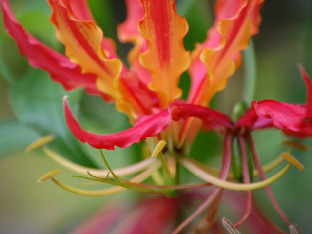グロリオサ・ロスチャイルディアナ 夏の花 2011年06月12日 グロリオサ・ロスチャイルディアナはユリ科グロリオサ属の蔓性多年草である。分類体系によってはイヌサフラン科とされる。グロリオサ属は1属1種である。本種はグロリオサ・スペルバの園芸品種とされている。原産地はアフリカの西部である。ジンバブエでは国花とされている。和名は百合車(ユリグルマ)という。草丈は100~150センチくらいである。葉は幅の広い線形で大きい。開花時期は6~9月くらいである。1本の花茎に10輪くらいの花をつける。花被片は長さが10センチくらいあり、紅色にオレンジ色の覆輪が入る。花の後にできる実はさく果(熟すると下部が裂け、種子が散布される果実)である。全草に有毒アルカロイドのコルヒチンを含む。属名の Gloriosa はラテン語の「gloriosus(見事な)」からきている。種小名の superba は「気高い」という意味である。品種名の Rothschildiana は園芸界を後援したイギリスの男爵「ロスチャイルド(F. J.de Rothschild)さんの」という意味である。写真は6月に東京都薬用植物園で撮った。学名:Gloriosa superba 'Rothschildiana'★色合いがどこか派手だね百合車 どこか納得アフリカの花花図鑑植物図鑑