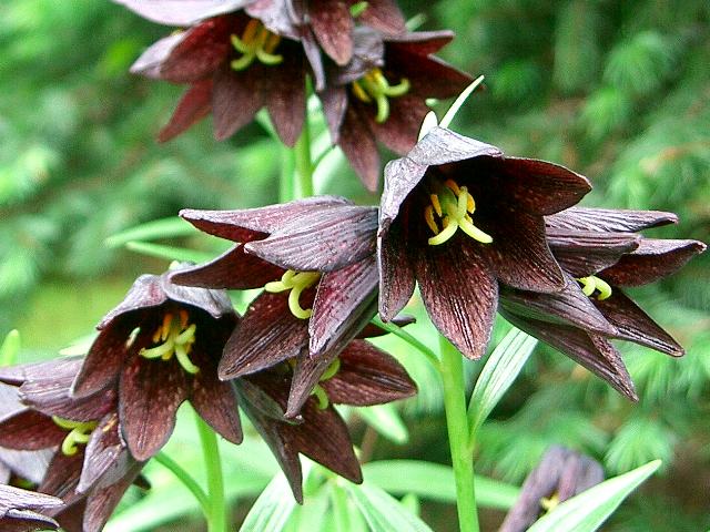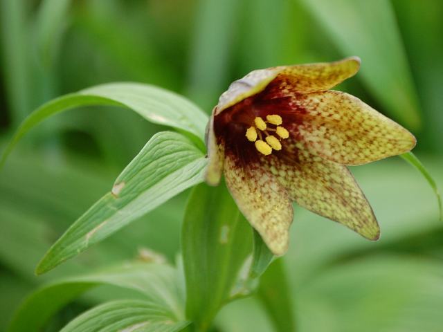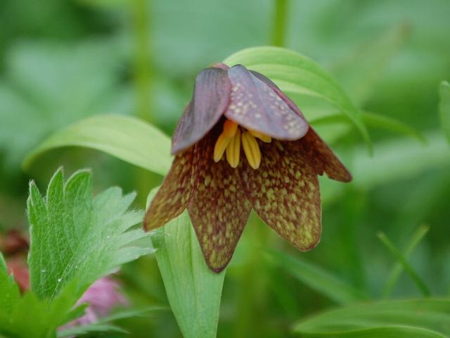 黒百合(クロユリ) 夏の花 2011年06月13日 黒百合(クロユリ)はユリ科バイモ属の多年草である。北方領土を含む北海道の低地と本州中部以北の高山に分布し、お花畑や岩場に生える。以前はこの両者は別種とされていたが、今は同一種と見られることが多い。区別する場合は、本州のものは深山黒百合(ミヤマクロユリ:Fritillaria camtchatcensis var. alpina)とされる。海外では、サハリン、カムチャツカ、ウスリー、北アメリカ北西部などにも分布する。草丈は10~30センチくらいである。葉は披針形で、茎の中ほどから上に3~5枚ずつ数段に輪生させ、上部では互い違いに生える(互生)。開花時期は6~8月である。茎の先に暗い紫褐色で斑がある鐘状の花を1~2輪つける。花径は3センチほどで、やや下向きに咲く。花被片は6枚である。花の後にできる実はさく果(熟すると下部が裂け、種子が散布される果実)である。この花には様々な伝説がある。アイヌ伝説では、「愛する人にこの花を贈って、それを相手の人が手に取れば二人は結ばれる」という言い伝えがある。また、越中富山の佐々成政は、寵愛した腰元早百合に嫉妬して一族を皆殺しにする。そのとき早百合は「私の亡霊が立山に黒百合を咲かせたとき、佐々家は滅びるだろう」と叫んで息絶えた。その後、成政が大茶会で北の政所(秀吉の正妻)に取り入ろうとして立山の黒百合を贈ったところ、不吉な花として怒りを買い、佐々家も衰運の一途をたどることになる。そして、成政は切腹し、佐々家も滅びたという。俳句の季語は夏である。属名の Fritillaria はラテン語の「fritillus(チェッカー盤)」からきている。この属の1種の花の模様から名づけられた。種小名の camtschatcensis は「カムチャツカの」という意味である。写真は7月に中央アルプスの千畳敷カールで撮った。3枚目は6月に札幌市の百合が原公園で撮った。学名:Fritillaria camtschatcensis★鐘の音とシスターの姿目に浮かぶ そんなシーンが記憶の隅に花図鑑植物図鑑
