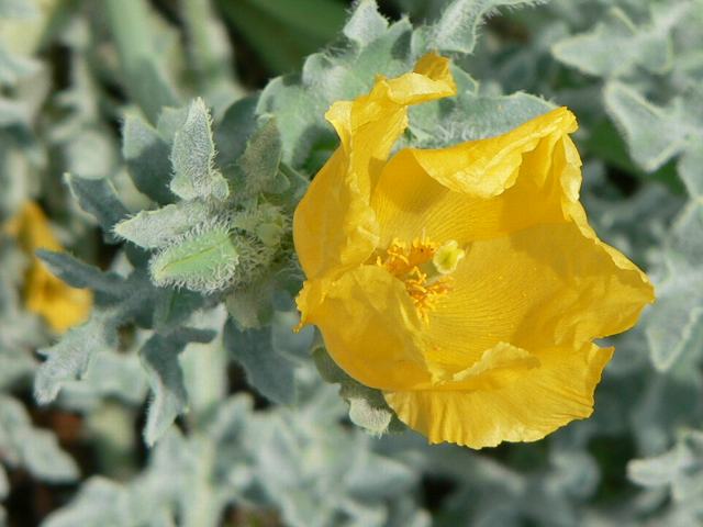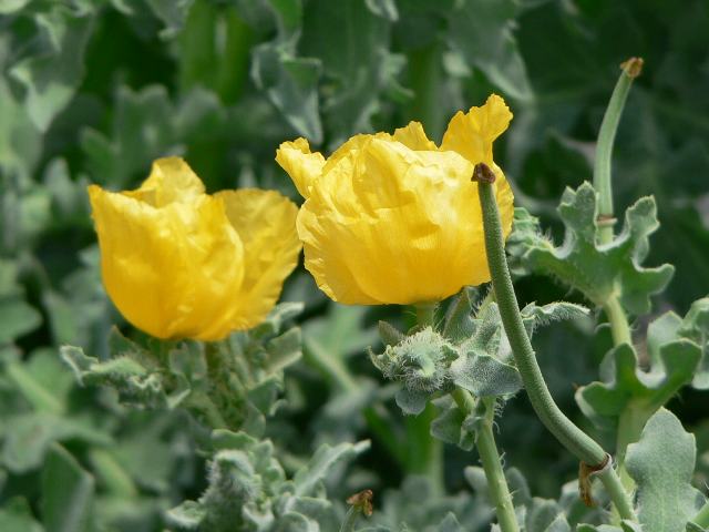 角罌粟(ツノゲシ) 夏の花 2011年06月14日 角罌粟(ツノゲシ)はケシ科ツノゲシ属の越年草である。漢字では「角芥子」とも書く。原産地はヨーロッパである。南ヨーロッパの沿岸地域などに分布する。日本では観賞用として稀に栽培される。逸出して野生化したものが昭和時代の初期に確認されている。草丈は60~100センチくらいである。葉はやや多肉質で銀白色を帯びる。葉は羽状に裂けて、互い違いに生える(互生)。根際から生える葉はロゼット状(茎から葉が重なり合って出て地に接し、円座形になったもの)となる。開花時期は5~7月である。茎先に花径5~10センチくらいの4弁花をつける。花の色には黄色のほか黄橙色や赤橙色などのものがある。花の後にできる実はさく果(熟すると下部が裂け、種子が散布される果実)である。実の莢はカーブして角状となる。それが名の由来でもある。英名はホーンドポピー(horned poppy)である。ホーンドは「角のある」という意味である。全草にアルカロイドを含み有毒である。しかし、種子には毒は含まれず、種子を搾った油は食用となる。また、種油はかつてランタンの油として用いられたという。属名の Glaucium はギリシャ語の「glaukos(灰緑色)」からきている。種小名の flavum は「黄色の」という意味である。写真は5月に東京都薬用植物園で撮った。学名:Glaucium flavum★ごつごつと強面のする姿でも 花は可憐に色鮮やかに花図鑑植物図鑑PR