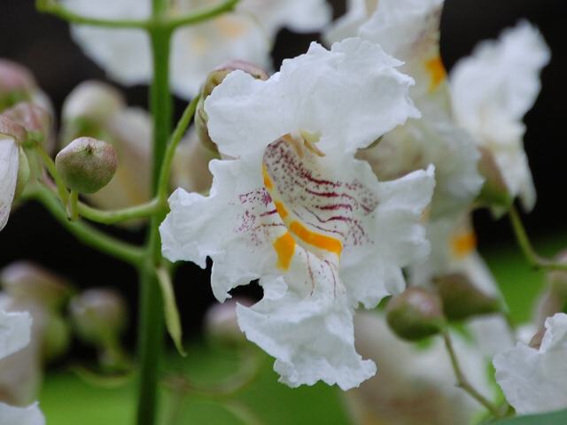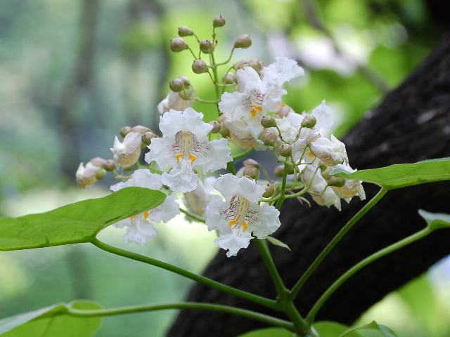 花木大角豆(ハナキササゲ) 夏の花 2011年06月04日 花木大角豆(ハナキササゲ)はノウゼンカズラ科キササゲ属の落葉高木である。原産地は北アメリカである。湿った森林、沢地、川辺などに生える。明治・大正時代に「黄金樹」の名で大量に輸入されたが、現存するものは少ないという。樹高は15~30メートルくらいである。葉は大きな三角形状の幅広い卵円形で、向かい合って生える(対生)。葉の形は桐(キリ)に似ている。開花時期は5~7月である。葉の脇に円錐花序(下のほうになるほど枝分かれする回数が多く、全体をみると円錐形になる)を出し、大きな釣鐘形の花をつける。花径が4~5センチくらいある白い花は縁が縮れており、中には紫の点線とオレンジ色の筋が入っている。花の後にできる実はさく果(熟すると下部が裂け、種子が散布される果実)である。近縁種に中国原産の木大角豆(キササゲ)がある。木大角豆(キササゲ)の名の由来は、実の形が大角豆(ササゲ)というさやごと食べる豆に似ていることからきている。和名の由来は、その木大角豆(キササゲ)より更に花が美しいということからきている。別名を大アメリカ木大角豆(オオアメリカキササゲ)ともいう。属名の Catalpa はこの属のアメリカキササゲの北アメリカでの現地名からきている。種小名の speciosa は「華やかな」という意味である。写真は6月に小石川植物園で撮った。学名:Catalpa speciosa★ぽたぽたと落ちる花びら美しく ふと見上げれば満開模様花図鑑今日の花ドットコム