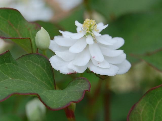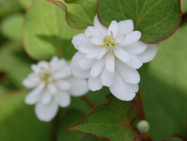 八重毒痛み(ヤエドクダミ) 夏の花 2011年06月05日 毒痛み(ドクダミ)はドクダミ科ドクダミ属の多年草である。北海道の南部から沖縄にかけて分布し、日陰や湿地に生える。海外では、東アジアや東南アジアに広く分布する。八重毒痛み(ヤエドクダミ)はその品種の1つである。草丈は20~40センチくらいである。葉は先の尖った心臓形で、互い違いに生える(互生)。葉の質は柔らかい。開花時期は5~6月である。茎先に八重咲きの白い花を咲かせる。花びらのように見えるものは、葉に近い性質をもった総苞と呼ばれるものである。花の真ん中に見える黄色い部分が花だが、花弁も萼片もない。種子は不稔性(次の世代の子孫を作れない)である。和名の由来は、毒や傷みに効くということから、「毒痛み」が転じたものといわれる。あるいは、ドクダミの葉は特有の臭気があるため、毒が入っているのではないかということで毒溜め(ドクダメ)と呼ばれるようになり、それがドクダミになったという。そのほかにもいろいろな説があるらしい。生薬名を十薬(じゅうやく)といい、整腸、利尿、解毒などの薬効がある。俳句の季語は夏である。属名の Houttuynia はオランダの医師で植物学者の「ハウトイン(M. Houttuyne)さん」にちなんで名づけられた。種小名の cordata は「心臓形の」という意味である。品種名の plena は「八重の」という意味である。写真は6月に小石川植物園で撮った。学名:Houttuynia cordata f. plena★十の字が印とばかり思いきや 八重に花咲くドクダミのあり花図鑑今日の花ドットコム