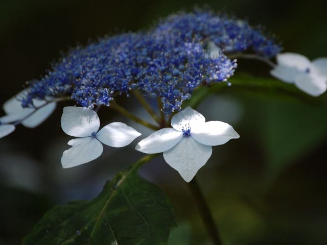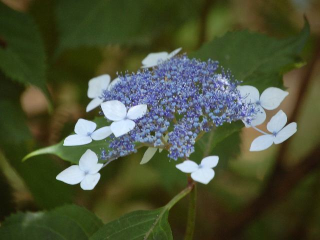 甘茶(アマチャ) 夏の花 2011年06月07日 甘茶(アマチャ)はユキノシタ科アジサイ属の落葉低木である。分類体系によってはアジサイ科とされる。分類上は山紫陽花(ヤマアジサイ)の変種の1つとされる。日本固有種である。本州の関東地方と中部地方に分布し、山地に生える。また、葉にズルチンを含み甘茶製造用に栽培される。樹高は50~100センチくらいである。葉は楕円形で、向かい合って生える(対生)。葉には柄があり、縁にはぎざぎざ(鋸歯)がある。開花時期は6~7月である。山紫陽花(ヤマアジサイ)と非常によく似た花をつける。真ん中に紫色を帯びた両性花がつき、周りを装飾花が取り囲む。花の後にできる実はさく果(熟すると下部が裂け、種子が散布される果実)である。属名の Hydrangea はギリシャ語の「hydro(水)+angeion(容器)」からきている。さく果の形からから名づけられた。種小名の serrata は「鋸歯のある」という意味である。変種名の thunbergii はスウェーデンの植物学者で日本の植物を研究した「ツンベルクさんの」という意味である。写真は6月に小石川植物園で撮った。学名:Hydrangea serrata var. thunbergii★紫の高貴な花は見るほどに 風情溢れてため息の漏れ花図鑑今日の花ドットコム