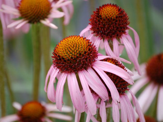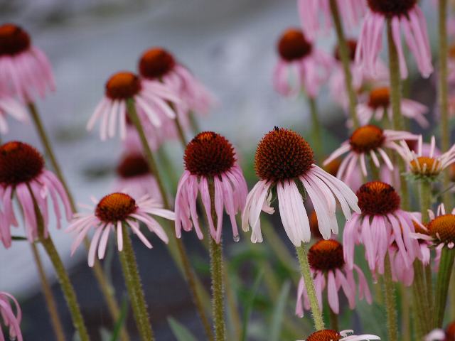 エキナケア・アングスティフォリア 夏の花 2011年06月09日 エキナケア・アングスティフォリアはキク科ムラサキバレンギク属(エキナケア属)の多年草である。属名の読み方は「エキナセア」とするものもある。原産地は北アメリカである。英名をナロウリーブド・パープルコーンフラワー(narrow-leaved purple coneflower)という。和名は細葉紫馬簾菊(ホソバムラサキバレンギク)である。「馬簾」というのは火消しの纏(まとい)の飾りのことである。根の成分が免疫力の向上に有効で、サプリメントとして利用されている。草丈は50~90センチくらいである。葉は細長い披針形(笹の葉のような形)で、互い違いに生える(互生)。近縁種のエキナケア・プルプレアよりも葉は細い。開花時期は6~9月くらいである。花びら(舌状花)の色はピンクないし淡い紫色である。筒状花は円錐状である。開花が進むにつれて舌状花が下向きに反り返り、「馬簾」のようになる。花の後にできる実はそう果(熟しても裂開せず、種子は1つで全体が種子のように見えるもの)である。属名の Echinacea はギリシャ語の「echino(はりねずみ)」からきている。硬い筒状花をはりねずみにたとえて名づけたものである。種小名の angustifolia は「細葉の」という意味である。写真は6月に東京都薬用植物園で撮った。学名:Echinacea angustifolia★どこでどう見分けたらいいエキナケア 数の多さに目を白黒と花図鑑今日の花ドットコムPR