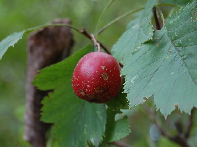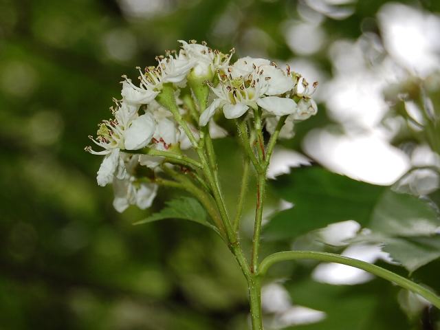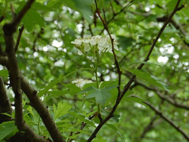 大実山査子(オオミサンザシ) 春の花 2011年05月10日 大実山査子(オオミサンザシ)はバラ科サンザシ属の落葉高木である。中国北部、朝鮮半島、東シベリアに分布している。中国では果樹として栽培もされている。別名を大山査子(オオサンザシ)ともいう。樹高は5~7メートルくらいである。葉は卵形で、互い違いに生える(互生)。葉の先は尖り、縁にはぎざぎざ(鋸歯)がある。開花時期は4~5月である。小さな白い5弁花を球状にたくさんつける。花の後にできる実は偽果(子房以外の部分が食べられる部分になった果実)で径が2~3センチあり、秋に赤く熟する。生食ができ、ゼリーなどにも加工される。実を乾燥させたものを生薬の山査子 (さんざし)といい、健胃、整腸などの薬効がある。属名の Crataegus はギリシャ語の「kratos(力)+agein(持つ)」からきている。材が堅いことから名づけられた。種小名の pinnatifida は「羽状中裂の」という意味である。花の写真は5月に東京都薬用植物園で撮った。実の写真は10月に東京都薬用植物園で撮った。学名:Crataegus pinnatifida★よく熟れた大実山査子美味しそう 秋の陽射しに照り輝いて今日の花ドットコム花図鑑