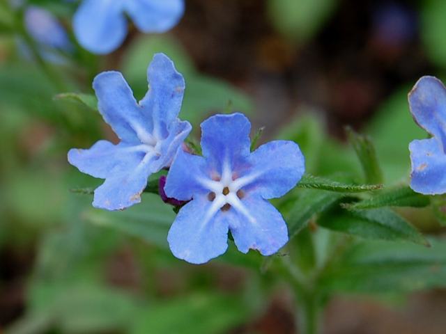 蛍蔓(ホタルカズラ) 春の花 2011年05月11日 蛍蔓(ホタルカズラ)はムラサキ科ムラサキ属の多年草である。北海道から沖縄にかけて分布し、林の中や草地に生える。海外では、台湾、朝鮮半島、中国にも分布する。草丈は10~20センチくらいである。茎は細く、地を這って広がる。葉は楕円形で、互い違いに生える(互生)。茎と葉には毛が生えている。開花時期は4~5月である。茎先の葉の脇から短い花柄を出し、花径2センチくらいの青い花をつける。花冠は5つに裂けて横に広がり、裂片の真ん中には白い筋が入る。雄しべは5本である。花の後にできる実は分果(複数の子房からできた果実)で、4つのブロックからなる。花の後に、根際から地面を這う茎を出し新しい株をつくる。和名の由来は、星形に見える白い筋を蛍の光に見立てたものである。なお、「蔓」というのは蔓状の茎をした植物のことである。別名を蛍草(ホタルソウ)という。属名の Lithospermum はギリシャ語の「lithos(石)+ sperma(種子)」からきている。小堅果を結ぶ性質から名づけられた。種小名の zollingeri はオランダの植物学者「ツォーリンゲル(H. Zollinger)さんの」という意味である。写真は5月に東京都薬用植物園で撮った。学名:Lithospermum zollingeri★涼しげに花びら広げ煌けど 蛍蔓は溜め息混じり今日の花ドットコム花図鑑