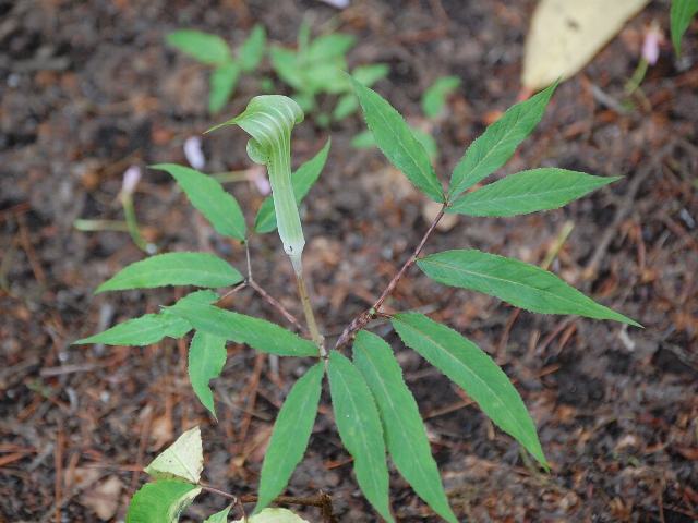 細葉天南星(ホソバテンナンショウ) 春の花 2011年05月12日 細葉天南星(ホソバテンナンショウ)は、サトイモ科テンナンショウ属の多年草である。日本固有種である。本州の関東地方から近畿地方にかけて太平洋側に分布し、山地の林の中に生える。箱根や富士山でよく見られるという。草丈は40~80センチくらいである。葉は2枚が互い違いに生える(互生)。葉は10~20枚くらいに深く裂ける。裂片の形は線状披針形で細長い。それが和名の由来でもある。開花時期は4~6月くらいである。仏炎苞(サトイモ科の肉穂花序に見られる花序を被う大形の苞)は緑色で、白いストライブが入る。付属体がこん棒状ではなく、先が細いのが特徴である。花の後にできる実は液果(果皮が肉質で液汁が多い実)の集合果である。属名の Arisaema はギリシャ語の「aris(植物名の1つ)+haima(血)」からきている。血のような斑点が葉にある植物といった意味合いになる。種小名の angustatum は「狭くなった」という意味である。写真は5月に東京都薬用植物園で撮った。学名:Arisaema angustatum★細い葉と緑の苞が違うんだ いろいろあるね天南星も今日の花ドットコム花図鑑