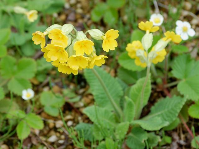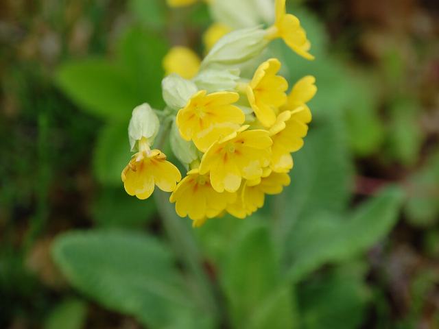 黄花の九輪桜(キバナノクリンザクラ) 春の花 2011年04月30日 黄花の九輪桜(キバナノクリンザクラ)はサクラソウ科サクラソウ属の多年草である。原産地はアフリカ北部、地中海沿岸地方、西アジアなどである。草丈は10~20センチくらいである。茎は直立し、毛が生えている。根際からはへら形の葉が数枚生える。葉には柄があり、縁には不規則な切れ込みがある。葉の表面には皺があり、葉のつけ根は狭くなって柄とつながる。開花時期は4~6月である。茎先に総状花序(柄のある花が花茎に均等につく)を出し、花径2~3センチの黄色い花を数輪横向きにつける。花冠は先で5つに裂け、横に平らに開く。それぞれの裂片の先は浅く2つに裂ける。花の真ん中には橙色の斑がある。萼片は白色を帯び、5枚である。雄しべは5本、雌しべは1本である。花には香りがある。花の後にできる実はさく果(熟すると下部が裂け、種子が散布される果実)である。花や葉は、去痰や鎮静などの薬効がある。英名はカウスリップ(cowslip)である。これは牧場によく生えていたことからつけられた名前である。学名からきたプリムラ・ベリスの名でも流通している。属名の Primula はラテン語の「primos(最初)」の縮小形である。同属の1種が他に先駆けて早春に花咲くことで名づけられた。種小名の veris は「春の」という意味である。写真は4月に箱根湿生花園で撮った。学名:Primula veris★愛らしい名前もらって嬉しいと 群がりて咲く黄花賑やか今日の花ドットコム花図鑑