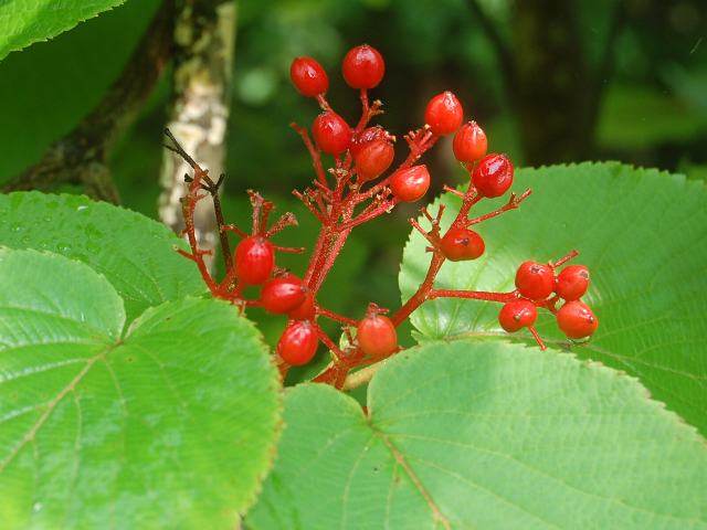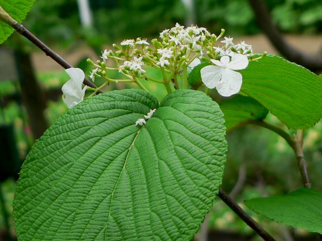 大亀の木(オオカメノキ) 春の花 2011年05月01日 大亀の木(オオカメノキ)はスイカズラ科ガマズミ属の落葉低木である。北方領土を含む北海道から九州にかけて分布し、山地から亜高山にかけて生える。海外では、朝鮮半島やサハリンにも分布する。和名の由来は、卵円形の葉の形を亀の甲羅に見立てたものである。別名を「ムシカリ」ともいう。これは葉に虫がよくつくことからの命名である。樹高は3~4メートルくらいである。樹皮は暗い灰褐色をしている。葉は向かい合って生える(対生)。葉の先は鋭く尖り、縁には重鋸歯(大きなぎざぎざに更に細かなぎざぎざがある)がある。葉の表面は濃い緑色、裏面は淡い緑色をしている。開花時期は4~5月である。葉の展開直後に花が咲く。枝先に散房花序(柄のある花がたくさんつき、下部の花ほど柄が長いので花序の上部がほぼ平らになる)を出し、白い花をたくさんつける。花序の中心には両性花がつき、その周りに花径2~3センチの装飾花をつける。両性花の花びらは5つに分かれ、花径は6~8ミリくらいである。短い雄しべが5本あり、真ん中に雌しべがある。花の時期は短い。花の後にできる実は楕円形の核果(水分を多く含み中に種が1つある)で、赤く熟する。果実酒にすると美味しい。秋には紅葉がきれいである。材は弓や輪かんじきの材料となる。属名の Viburnum はこの属1種のラテン古名だが意味はわかっていない。種小名の furcatum は「フォーク状の」という意味である。花の写真は5月に北大植物園で撮った。実の写真は8月に日光植物園で撮った。学名:Viburnum furcatum★たくさんの赤い実つけて誰招く 大亀の木の葉は個性的今日の花ドットコム花図鑑