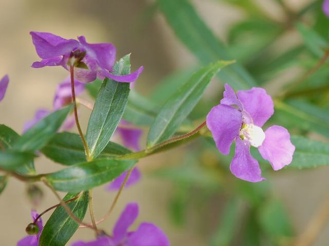 アンゲロニア 夏の花 2011年05月03日 アンゲロニアはゴマノハグサ科アンゲロニア属の多年草である。分類体系によってはオオバコ科とされる。原産地は中央アメリカから西インド諸島にかけてである。草丈は60~120センチくらいである。花茎が次々と伸びて、こんもり茂る。葉は披針形で、向かい合って生える(対生)。葉の先は尖り、縁にはぎざぎざ(鋸歯)がある。開花時期は5~10月である。暖地では周年開花をする。花の色は青、紫色、白、ピンクなどのものがある。花径は1センチくらいだが、たくさんの花がつく。花冠は5つに裂け、喉の部分には模様が入る。花はよい香りがする。花の後にできる実はさく果(熟すると下部が裂け、種子が散布される果実)である。英名はサマースナップドラゴン(summer snapdragon)である。スナップドラゴンは金魚草(キンギョソウ)のことである。属名の Angelonia はギリシャ語の「Angelos(天使)」からきている。種小名の angustifolia は「細葉の」を意味する。写真は4月に神奈川県立フラワーセンター大船植物園で撮った。学名:Angelonia angustifolia★暑さにはめっぽう強く夏花壇 彩り飾るアンゲロニアは今日の花ドットコム花図鑑