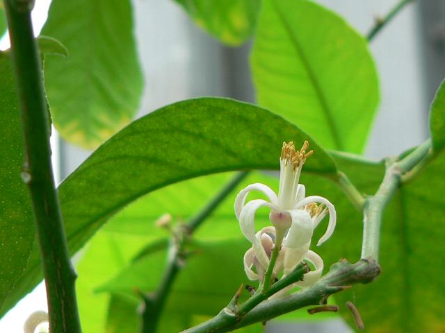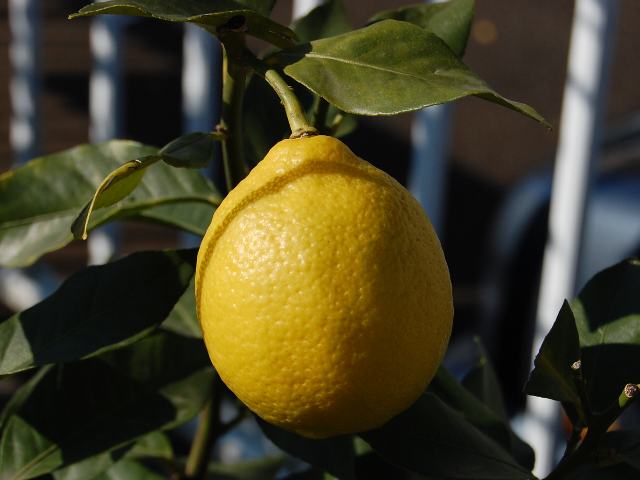 レモン 果実・野菜 2010年12月24日 レモン(lemon)はミカン科ミカン属の常緑低木である。原産地はインドのアッサム地方である。十字軍の遠征でヨーロッパに持ち帰られ、今では地中海沿岸地方が主産地となっている。コロンブスの航海にもビタミンCの供給源として持参されたという。日本へは明治時代に渡来した。樹高は1メートルから3メートルくらいである。葉の脇には棘がある。葉は長い楕円形ないし披針形で、互い違いに生える(互生)。葉は先が尖り、縁にはぎざぎざ(鋸歯)がある。開花時期は5月から6月である。葉の脇に総状花序(柄のある花が花茎に均等につく)を出し、香りのよい白い5弁花を咲かせる。果期は10月から12月である。果実は長楕円形で両端がとがり、レモン色に熟す。古くから、飲料や香料に利用されてきた。漢字では「檸檬」と書く。写真は12月にJAあゆみ野安行園芸センターで撮った。花の写真は4月に箱根強羅公園で撮った。学名:Citrus limon★ほんとはね寒さとっても苦手なの だけど我が儘言わないつもり今日の花ドットコム花図鑑