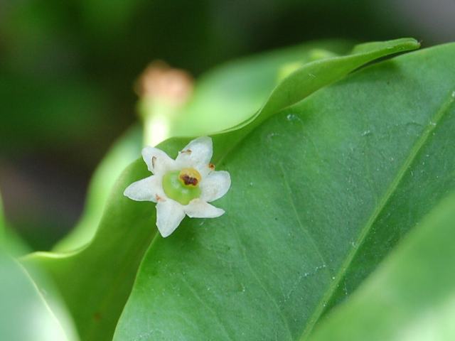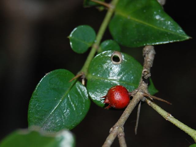蟻通し(アリドオシ) 果実・野菜 2010年12月27日 蟻通し(アリドオシ)はアカネ科アリドオシ属の常緑小低木である。本州の関東地方から沖縄にかけて分布し、山地の林の中に生える。海外では東アジアからインドにかけて分布する。別名を一両(イチリョウ)ともいう。樹高は30センチから60センチくらいである。葉の脇には細長い棘が生える。この棘が「蟻をも刺し通す」というのが和名の由来である。葉は楕円形で向かい合って生える(対生)。開花時期は4月から5月くらいである。葉の脇に白い小さな花を1、2輪ずつつける。花冠は長さ1センチくらいの筒状で、先が4つに裂ける。花の後にできる実は直径5ミリくらいの核果(水分を多く含み中に種が1つある)で、真っ赤に熟する。写真は12月に小石川植物園で撮った。花の写真は5月に日比谷公園の野草展(むさしの山草会)で撮った。学名:Damnacanthus indicus★小粒でも真っ赤に熟す実に加え 長い棘あり花も咲かそう今日の花ドットコム花図鑑