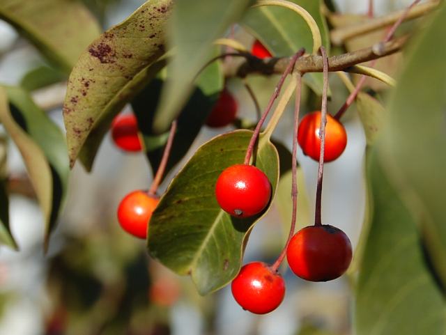 冬青(ソヨゴ) 果実・野菜 2010年12月25日 冬青(ソヨゴ)はモチノキ科モチノキ属の常緑高木である。本州の東北地方南部から九州にかけて分布し、山地に生える。海外では、中国、台湾にも分布する。樹高は5メートルから10メートルくらいである。和名の由来は、堅い葉が風にそよいでソヨソヨと音を立てることからきている。葉の形は卵形で、縁にぎざぎざ(鋸歯)はない。葉の長さは4センチから8センチくらいで、縁は波打っている。雌雄異株である。開花時期は5月から6月である。雌花は、葉の脇から花柄を出し、1個の小さな白い花をつける。花びらは5、6枚である。中心に大きな雌しべがあり、周りに小さな雄しべがある。雄花は枝分かれした花柄に数個の白い花をつける。花びらは4、5枚で、4、5個の雄しべがある。実は1センチくらいの球形の核果(水分を多く含み中に種が1つある)で、橙色から赤く熟する。材は白く緻密で、器具材、床柱などに使われる。別名を「ふくらしば」という。これは革質の葉を熱すると音を立てて弾けることからきている。種小名の pedunculosa は「花柄のある」を意味する。写真は12月にJAあゆみ野安行園芸センターで撮った。花の写真は6月に埼玉県花と緑の振興センターで撮った。学名:Ilex pedunculosa★そよぐ葉の下で静かに顔を出す 冬青(ソヨゴ)の花は内気に見えて今日の花ドットコム花図鑑