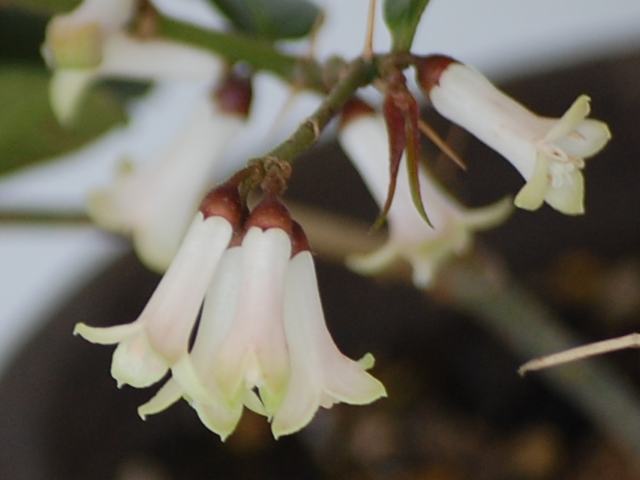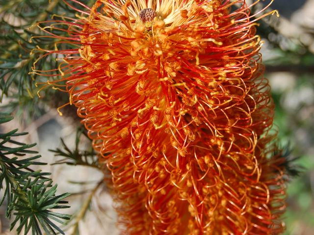 バンクシア・エリキフォリア 冬の花 2010年12月26日 バンクシア・エリキフォリアはヤマモガシ科バンクシア属の常緑小高木である。原産地はオーストラリア南東部のニューサウスウェールズ州である。英名はヒースバンクシア(health banksia)という。樹高は3~7メートルくらいである。葉は線形である。葉の表面は暗い緑色、裏面は灰白色である。日本での開花時期は1月から2月である。原産地では周年開花をする。長い円筒形のブラシのような穂状花序(柄のない花が花茎に均等につく)を出し、橙色の花をつける。長く飛び出しているのは花柱(雌しべの一部で柱頭と子房とをつなぐ部分)である。花被片が4枚あり、それぞれに雄しべが1本ずつつく。花の後にできる実は木質の袋果(熟すと果皮が自然に裂けて種子を放出する)である。松かさのようになり、種子は硬い殻の中にとどまって山火事を待つという。写真は12月につくば植物園で撮った。学名:Banksia ericifolia★不思議さは並みではないねバンクシア ブラシのような花に見とれて今日の花ドットコム花図鑑