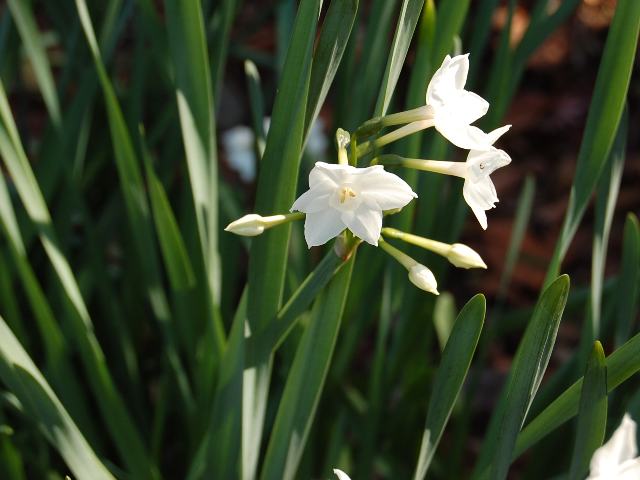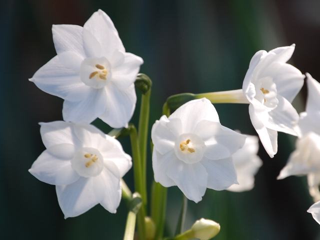 房咲き水仙(フサザキスイセン) 冬の花 2010年12月28日 房咲き水仙(フサザキスイセン)はヒガンバナ科スイセン属の多年草である。原産地は地中海沿岸地方である。日本水仙(ニホンズイセン)の基本種である。唐の時代より前にシルクロードを経由して中国に伝わった。日本へは中国を経由して渡来し、暖地の海岸近くに野生化している。イギリス王立園芸協会の分類ではタゼッタ水仙(タゼッタスイセン)とされている。タゼッタ(tazetta)はイタリア語に由来し「小型のコーヒーカップ」を意味する。花の形を譬えたものである。草丈は20センチから40センチくらいである。根際から生える葉は平らな線形で、時計回りにねじれる。開花時期は12月から4月くらいである。茎先に白い花を房状につける。副花冠は小さな杯状で白い。日本水仙(ニホンズイセン)の場合、副花冠は黄色い。根茎等にリコリンを含み有毒である。 写真は1月に小石川植物園で撮った。学名:Narcissus tazetta★絹の道たどりはるばる東方へ 伝わりし花冬を彩り今日の花ドットコム花図鑑PR