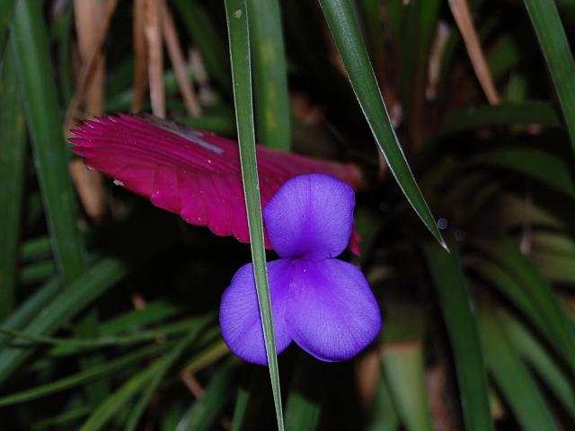 花アナナス(ハナアナナス) 四季咲きの花 2010年11月21日 花アナナス(ハナアナナス)はパイナップル科ハナアナナス属の多年草である。学名のティランドシア・キアネアの名称も使われている。学名の片仮名表記は「チランジア」とするものもある。原産地は南アメリカである。木の幹などに着生する。葉は細長い線形である。茎先につく苞(葉の変形したもの)は扁平でピンク色をしており、長持ちをする。この苞から紫色の花を咲かせる。花被片は6枚だが、外花被片3枚は小さくて見えないこともある。花は一日花だが次々と咲く。開花時期は周年である。写真は11月につくば植物園で撮った。学名:Tillandsia cyanea★鮮やかな苞もなかなかいいけれど 花が開けばそこは南国今日の花ドットコム花図鑑