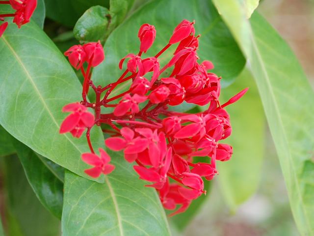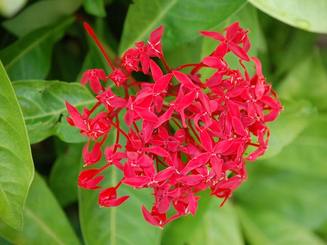 山丹花(サンタンカ) 四季咲きの花 2010年11月25日 山丹花(サンタンカ)はアカネ科サンタンカ属(イクソラ属)の常緑小低木である。原産地は中国南部やマレーシアである。日本へは江戸時代に琉球を経由して渡来した。樹高は20センチから100センチくらいである。葉は長い楕円形で、向かい合ってつける(対生)。葉は革質で濃い緑色をしており、やや艶がある。開花時期は5月から8月である。暖地では周年開花をする。枝先に散房花序(柄のある花がたくさんつき、下部の花ほど柄が長いので花序の上部がほぼ平らになる)を出し、赤い小さな花をたくさんつける。花冠は皿形で、先が4つに裂ける。多くの園芸品種があり、白、黄色、紅色、淡紅色、橙色などのものがある。沖縄では三段花(サンダンカ)とする場合もある。写真は12月に沖縄県本部町の熱帯・亜熱帯都市緑化植物園で撮った。学名:Ixora chinensis★寄せ合ってボールのように丸くなり 咲く山丹花葉は照り映えて今日の花ドットコム花図鑑PR