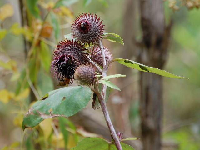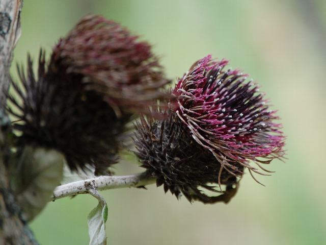 葉場山火口(ハバヤマボクチ) 秋の花 2010年10月17日 葉場山火口(ハバヤマボクチ)はキク科ヤマボクチ属の多年草である。本州の福島県から九州にかけて分布し、山地の草原などに生える。「葉場山」というのは草刈り場のある山のことである。「火口(ほくち)」というのは昔の人が火をつけるときに用いた綿毛のことである。かつては葉の裏側に密生する綿毛を乾燥させて「火口」に用いたという。草丈は1メートルから2メートルくらいである。根際から生える葉と茎につく葉がある。葉は三角状の矛形である。茎につく葉は、互い違いに生える(互生)。開花時期は10月ころである。上部で枝分かれをし、茎先に暗い紫色をした大きな花(頭花)を1つずつつける。花径は4センチから5センチくらいある。花は筒状花だけからなる。総苞(花序全体を包む葉の変形したもの)は球形で、くも毛が生える。総苞片は開出(軸に対して垂直に立つこと)し、先は棘状に尖る。写真は10月に軽井沢町植物園で撮った。学名:Synurus excelsus★我が身をば保つも難き大輪を 茎先につけ葉場山火口今日の花ドットコム花図鑑
