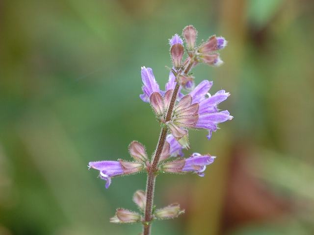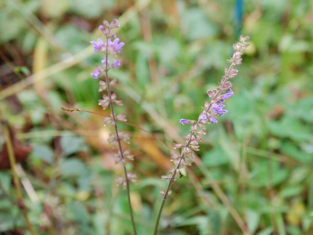毛夏の田村草(ケナツノタムラソウ) 秋の花 2010年10月18日 毛夏の田村草(ケナツノタムラソウ)はシソ科アキギリ属の多年草である。別名を深山田村草(ミヤマタムラソウ)ともいう。分類上は、夏の田村草(ナツノタムラソウ)の変種とされている。本州の東北地方から中部地方にかけて分布し、高山や亜高山の湿った林の縁や湿地に生える。草丈は20センチから50センチくらいである。茎の断面は四角形である。葉は3出葉ないし1-2回羽状複葉で、向かい合って生える(対生)。小葉の縁にはぎざぎざ(鋸歯)がある。開花時期は7月から10月くらいである。茎の上部に花穂を直立し、淡い青紫色をした唇形の花を数段輪生させて円錐状につける。近縁種の秋の田村草(アキノタムラソウ)と比較した夏の田村草(ナツノタムラソウ)の特徴は、雄しべが花冠から突き出ることである。本種の場合は、花冠に軟毛が生えている。写真は10月に軽井沢町植物園で撮った。学名:Salvia lutescens var. crenata★名前には似合わぬけれどじっくりと 秋深くまで花咲き続け今日の花ドットコム花図鑑