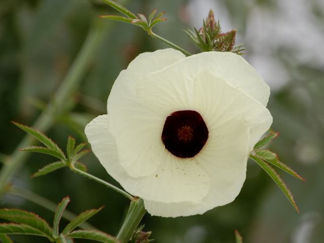 ケナフ 秋の花 2010年10月20日 ケナフ (kenaf)はアオイ科フヨウ属の一年草である。原産地はインドまたはアフリカとされている。繊維を目的として、インドやバングラデシュ、タイなどで栽培されてきた。製品は洋麻やボンベイ麻などとなる。草丈は3メートルから5メートルくらいである。成長が早く、茎の下部は太いもので10センチくらいになり、木質化する。茎はあまり枝分かれをせずに直立する。葉の形は株によって異なるが、はじめのうちはハート形で縁にぎざぎざ(鋸歯)がある。成長するににつれて3つから9つに切れ込みが増えていく。葉には長い柄があり、互い違いに生える(互生)。開花時期は8月から10月くらいである。上部の葉の脇に、横向きに花をつける。花径は8センチから10センチくらいで、花びら(花弁)は5枚である。花の色は白、黄色、紫などがあり、中心部は暗い紫色となる。萼片は5枚で先が尖る。雄しべは花糸が合着して柱状になる。一日花である。花の後にできる実はさく果(熟すると下部が裂け、種子が散布される果実)である。二酸化窒素を吸収することや木材に代わる紙資源として期待できることなどで注目を集めている。一方で、帰化による生態系への影響も懸念され、植栽する場合にはきちんとした管理が求められている。写真は10月に東京都薬用植物園で撮った。学名:Hibiscus cannabinus★騒がれてとても増えたのそれだけど ケナフの気持ち誰も知らない今日の花ドットコム花図鑑