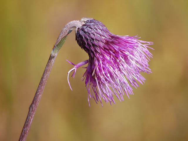 真薊(マアザミ) 秋の花 2010年10月21日 真薊(マアザミ)はキク科アザミ属の多年草である。本州から九州にかけて分布し、日当たりの良い湿地に生える。草丈は50センチから100センチくらいである。枝も葉も少なく、根際に生える葉が花の時期にもついている。また、茎には棘がない。開花時期は9月から10月くらいである。花(頭花)は紅紫色で、茎先に横向きないし斜め下向きにつく。その姿を煙草を吸う煙管に見立てて、煙管薊(キセルアザミ)の別名がある。下を向いた花は、花が終わると上を向く。写真は10月に箱根湿生花園で撮った。学名:Cirsium siebolbdii★すっと立つ茎の先から俯いた 真薊の花煙管思わせ今日の花ドットコム花図鑑PR