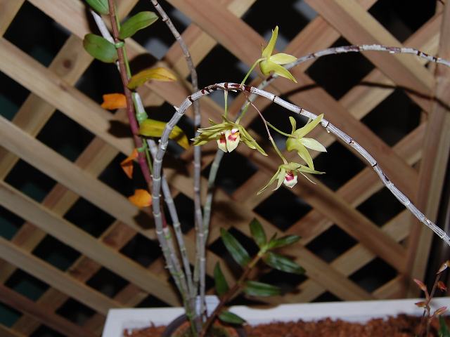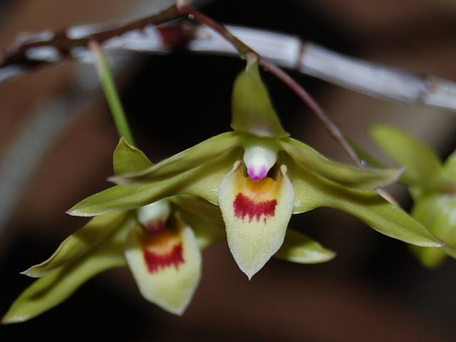 黄花の石斛(キバナノセッコク) 秋の花 2010年10月12日 黄花の石斛(キバナノセッコク)はラン科セッコク属の多年草である。四国から沖縄にかけてと八丈島に分布する着生種である。海外では、朝鮮半島、台湾、中国などにも分布する。環境省のレッドリスト(2007)では、「IA類ほどではないが、近い将来における絶滅の危険性が高い種」である絶滅危惧IB類(EN)に登録されている。茎は普通は下垂し、長さが15センチから40センチくらいになる。葉は披針形で、数枚が互い違いに生える(互生)。開花時期は7月から10月くらいである。淡い黄緑色をした数輪の花をつける。唇弁には紅紫色の斑紋が入る。写真は10月につくば植物園の絶滅危惧植物展で撮った。学名:Dendrobium stricklandianum(=Dendrobium tosaense)★小振りでもしっかりとした花の色 静かに咲いた黄花の石斛今日の花ドットコム花図鑑