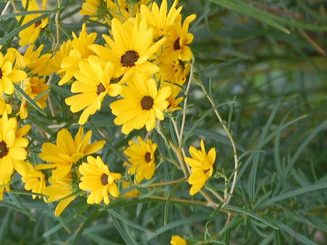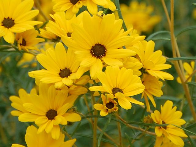 柳葉向日葵(ヤナギバヒマワリ) 秋の花 2010年10月15日 柳葉向日葵(ヤナギバヒマワリ)はキク科ヒマワリ属(ヘリアンサス属)の多年草である。原産地は北アメリカである。草丈は80センチから120センチくらいである。葉が細く、それが名の由来にもなっている。開花時期は9月から10月である。茎先に花径5センチくらいの向日葵(ヒマワリ)に似た黄色い花(頭花)をたくさんつける。舌状花は淡い黄色で、筒状花は褐色をしている。英名をゴールデンピラミッド(Gorden pyramid)という。属名のヘリアンサスの名でも流通している。写真は9月に京都府立植物園で撮った。学名:Helianthus salicifolius★茎先に煌くような花つけて 秋の実りや柳葉向日葵今日の花ドットコム花図鑑