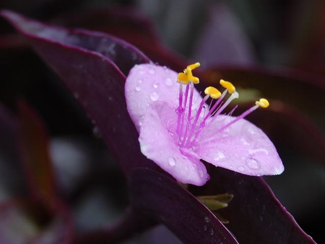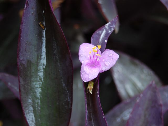 紫御殿(ムラサキゴテン) 秋の花 2010年10月16日 紫御殿(ムラサキゴテン)はツユクサ科ムラサキツユクサ属の多年草である。原産地はメキシコである。日本へは1955年に導入された。草丈は30センチから60センチくらいである。葉は細長い卵形で、互い違いに生える(互生)。葉や茎は鮮やかな黒紫色をしていて、表面には白っぽい毛が生える。葉は肉質で分厚い。葉の縁にぎざぎざ(鋸歯)はなく、つけ根の部分は茎を抱く葉鞘となる。開花時期は5月から11月と長い。花径2センチくらいの紅紫色をした3弁花である。真ん中に6本の雄しべと1本の雌しべが立ち上がる。葯(雄しべの花粉を入れる袋)の色は黄色い。英名をパープルハート(purple heart)という。写真は10月に川口市立グリーンセンターで撮った。学名:Tradescantia pallida cv. Purpurea(=Setcreasea pallida cv. Purpurea)★紫の葉が目を奪う変わり種 紫御殿は三角の花今日の花ドットコム花図鑑PR