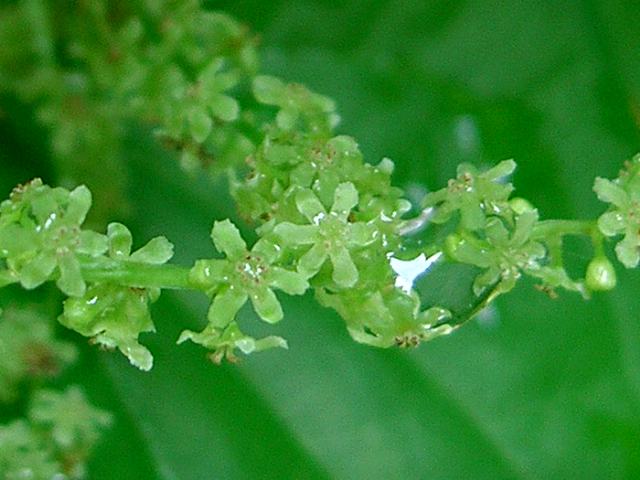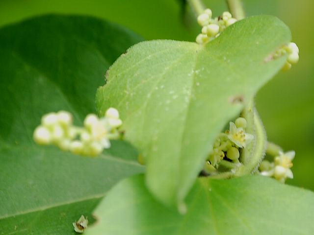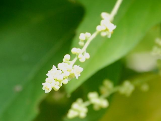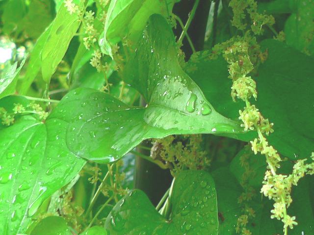 葛藤(ツヅラフジ) 夏の花 2015年08月16日 葛藤(ツヅラフジ)はツヅラフジ科ツヅラフジ属(シノメニウム属)の蔓性落葉低木である。シノメニウム属は本種のみの1属1種である。日本にも分布し、属名の和名をツヅラフジ属という。日本では本州の関東地方から沖縄にかけて分布し、山地の石灰岩の林の縁などに生える。海外では、台湾、中国、タイ、ネパール、インドの北部などにも分布する。和名の由来は藤(フジ)に似た蔓性の植物ということからきている。別名を大葛藤(オオツヅラフジ)ともいう。中国名は「風龍」である。茎や根茎を干したものを生薬で防已(ぼうい)といい、利尿・鎮痛作用がある。蔓の長さは10メートルに達する。葉は幅の広い卵形で、互い違いに生える(互生)。切れ込みのないものもあれば、浅く5つから7つに裂けるものもあり、変化が多い。葉の質は薄く、両面ともに毛は生えない。葉の柄が5センチから10センチくらいあり長いのが特徴である。雌雄異株である(同株のこともある)。開花時期は6月から8月くらいである。枝先や葉の脇から円錐花序(下のほうになるほど枝分かれする回数が多く、全体をみると円錐形になる)を出し、淡い緑色の小さな花をたくさんつける。花弁数は6枚、萼片数も6枚である。花の後にできる実は球形の核果(水分を多く含み中に種が1つある)で、黒く熟する。属名の Sinomenium はギリシャ語の「sino(中国の)+menis(半月)」からきている。中国産で果実の核が半月形であることから名づけられた。種小名の acutum は「鋭い形の」という意味である。写真は8月に小石川植物園で撮った。学名:Sinomenium acutum★面白味あるではないが葛藤 姿地味でも人に役立ち花図鑑植物図鑑|味の麺匠戸田久|おこめの鬼平|フロム蔵王|花の本屋さん|楽天トラベル|