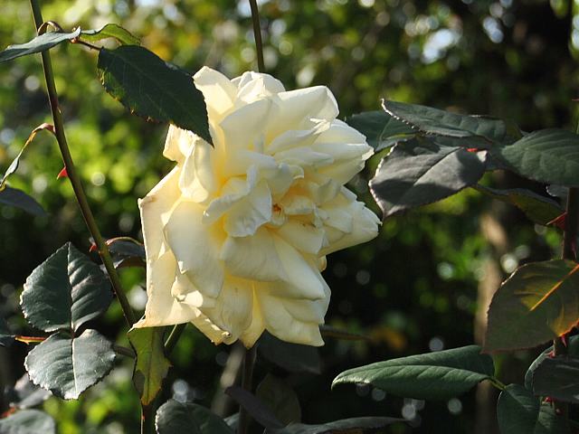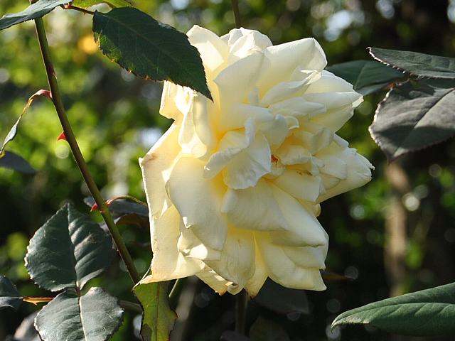 カイザリン・アウグステ・ビクトリア 秋の花 2015年10月02日 カイゼリン・アウグステ・ビクトリア(Kaiserin Auguste Viktoria)はバラ科バラ属の落葉低木である。ハイブリッドティ系(Hybrid Tea:HT)と呼ばれるものの1つで、四季咲きの大輪である。(薔薇図鑑参照)1891年にドイツのランベルト(Peter Lambert)によって作出された。ハイブリッドティ系としては初期のもので、オールドローズ(Old Rose:O)のティローズ系(Tea Rose:T)の雰囲気を残す。園芸品種名はドイツ皇帝であったウィルヘルム2世の妃の名からきている。戦前の日本では敷島(シキシマ)の名で流通していた。「敷島」は日本の古い国号の1つで、戦艦名や力士名、煙草の名などにも用いられている。樹高は100センチから180センチくらいである。樹形は木立性である。花には微香がある。開花時期は5月から11月である。花径15センチくらいの剣弁高芯咲きの八重で、花の色は真ん中が緑がかった白である。咲き進むとロゼット咲きになる。花弁数は100枚くらいである。写真は11月に京成バラ園で撮った。学名:Rosa 'Kaiserin Auguste Viktoria'★近代を具現するかと思わせる 花の姿に歴史を重ね花図鑑植物図鑑|味の麺匠戸田久|おこめの鬼平|フロム蔵王|花の本屋さん|楽天トラベル|