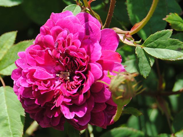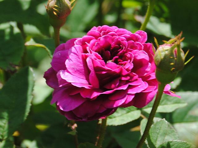紫玉(シギョク) 夏の花 2015年05月30日 紫玉(シギョク)はバラ科バラ属の落葉低木である。オールドローズ(Old Rose:O)のガリカ系(Gallica:P)と呼ばれるものの1つで、一季咲きの中輪である。ガリカ系というのはフランス薔薇(フランスバラ, Rosa gallica)が交配にかかわっている品種群で、花の色が濃い赤い花となり、棘が少ないのが特徴である。作者は不祥だが19世紀の後半に日本で作出された。樹高は120センチから180センチくらいである。樹形は半横張りである。開花時期は5月である。花径6センチくらいのポンポン咲きの八重である。花の色は紅紫色で、咲き進むと青味がかった紅紫色から黒味のある紅紫色へと変化する。花弁数は100枚から150枚くらいである。花にはダマスク系の中香がある。属名の Rosa はケルト語の「rhodd(赤色)」からきている。写真は5月につくば植物園で撮った。学名:Rosa 'Shigyoku'★名の通り玉を思わす咲き方に 日本の技の冴えを感じて薔薇図鑑花図鑑植物図鑑|味の麺匠戸田久|おこめの鬼平|フロム蔵王|花の本屋さん|楽天トラベル|