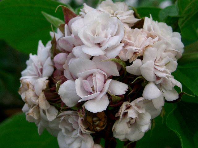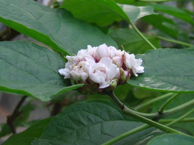 八重咲き臭木(ヤエザキクサギ) 春の花 2015年03月25日 八重咲き臭木(ヤエザキクサギ)はクマツヅラ科クサギ属(クレロデンドルム属)の常緑低木である。分類体系によっては(APGIII)シソ科とされる。クレロデンドルム属は世界に150種から450種くらいが分布する。日本にも臭木(クサギ)などが分布し、属名の和名をクサギ属という。本種の原産地は台湾、中国、ベトナム、タイ、カンボジア、ラオス、フィリピン、インドネシアなどである。樹高は1メートルから2メートルである。枝の断面は四角形である。葉は幅の広い卵形で、向かい合って生える(対生)。葉の質は薄く、縁には不規則なぎざぎざ(鋸歯)がある。開花時期は4月から5月くらいである。枝先に集散花序(茎先に花がつき、少し下から横枝が出てその先にも花がつく)を出し、白ないし淡い桃色をした八重咲きの花を手まり状につける。花には甘い香りがある。属名の Clerodendrum はギリシャ語の「cleros(運命)+dendron(樹木)」に由来する。スリランカにあった同属の2種を「幸運の木」「不運の木」と呼んだことからきている。種小名の chinense は「中国の」という意味である。写真は4月に箱根町の芦之湯フラワーセンターで撮った。学名:Clerodendrum chinense(syn. Clerodendrum fragrans)★臭木にも八重咲きをする花がある 花咲く時期は異なるけれど花図鑑植物図鑑|味の麺匠戸田久|おこめの鬼平|フロム蔵王|花の本屋さん|楽天トラベル|