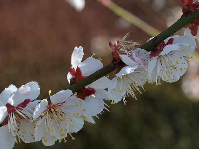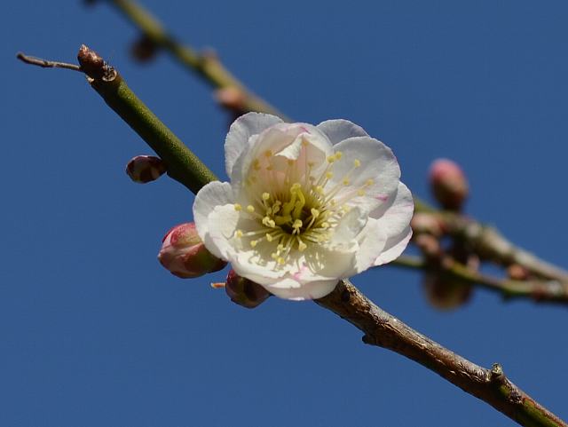 巻立山(マキタチヤマ) 春の花 2015年03月27日 梅(ウメ)はバラ科サクラ属の落葉小高木である。中国原産で、日本へは古代に渡来した。巻立山(マキタチヤマ)は梅(ウメ)の栽培品種の1つである。読み方は「マキタツヤマ」とするものもある。樹高は3メートルから6メートルくらいである。葉は楕円形で、互い違いに生える(互生)。開花時期は2月から3月である。葉の展開に先立って花を咲かせる。豊後系・豊後性の一重咲きの中輪(20から25ミリ)である。花の色は白い。裏弁は爪紅絞りとなる。「爪紅」は花弁の先が赤いことで、「絞り」は白に紅が入ることを意味する。抱え咲きで、花弁は波打つ。属名の Prunus は「plum(スモモ)」を意味する。種小名の mume は「梅」のことである。写真は3月に水戸市の弘道館公園で撮った。学名:Prunus mume 'Makitatiyama'★調べても梅の名だけが出てくるね 由来知りたい巻立山の花図鑑植物図鑑|味の麺匠戸田久|おこめの鬼平|フロム蔵王|花の本屋さん|楽天トラベル|