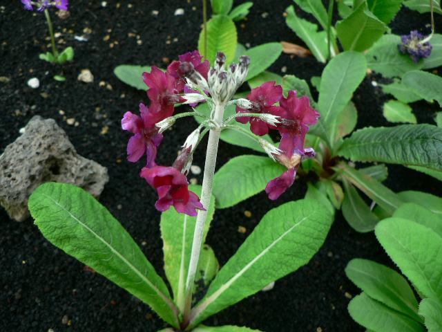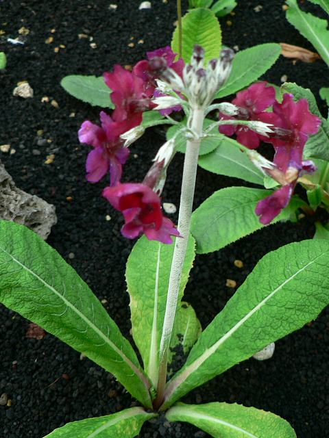 プリムラ・プルベルレンタ 春の花 2015年03月28日 プリムラ・プルベルレンタはサクラソウ科サクラソウ属(プリムラ属)の多年草である。プリムラ属は北半球の温帯や寒帯に500種くらい分布する。また、多くの園芸品種が作出されているる日本にも桜草(サクラソウ)などが分布するので、属名の和名をサクラソウ属という。本種の原産地は中国の四川省の西部で、標高2200メートルから2500メートルの山地の林の中に生える。英名をキャンドラブラ・プリムラ(candelabra primula)という仲間の1つである。キャンドラブラは「枝分かれした燭台」を意味する。この仲間としては、日本にも九輪草(クリンソウ)が分布する。草丈は60~100センチである。茎や葉は白い粉をふいている。根際から生える葉は長い楕円形で、ロゼット状(茎から葉が重なり合って出て地に接し、円座形になったもの)となる。葉の縁にはぎざぎざ(鋸歯)がある。開花時期は4月から6月くらいである。花は地上から伸びた花径の先に層のようになって数段に輪生してつく。花の色は鮮やかな紅紫色である。花径は1センチから2センチくらいである。1つ1つの花冠は5つに裂け、5枚の萼片がある。雄しべは5本、雌しべは1本である。花の後にできる実はさく果(熟すると下部が裂け、種子が散布される果実)である。属名の Primula はラテン語の「primos(最初)」縮小形である。プリムラ・ベリスが早春に他に花に先駆けて咲くことから名づけられた。種小名の pulverulenta は「粉っぽい」という意味である。写真は4月に大阪市の咲くやこの花館で撮った。学名:Primula pulverulenta★もう少し背丈は伸びてくるのかな なるほど茎は粉っぽいかな花図鑑植物図鑑|味の麺匠戸田久|おこめの鬼平|フロム蔵王|花の本屋さん|楽天トラベル|