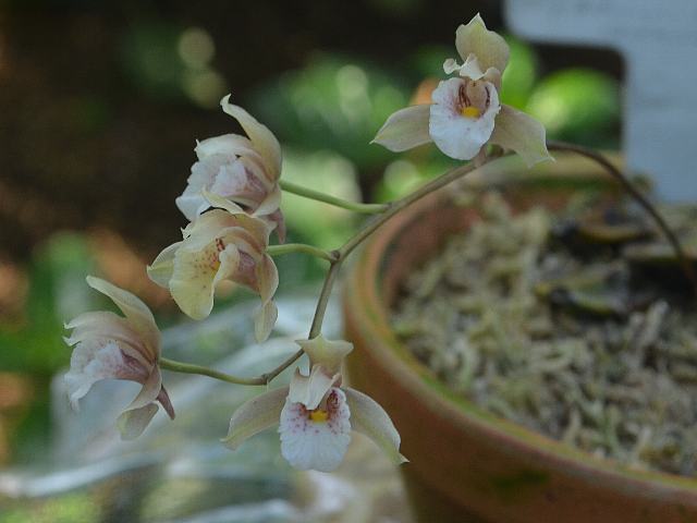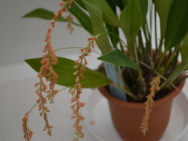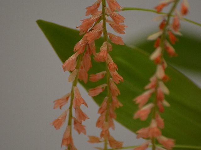 デンドロキルム・コンバラリーフォルメ 冬の花 2015年02月14日 デンドロキルム・コンバラリーフォルメはラン科デンドロキルム属の多年草である。デンドロキルム属は熱帯アジアを中心に150種ほどが分布する着生種である。本種の原産地はフィリピンである。標高300メートルから900メートルの日陰に生える着生種である。草丈は20センチくらいである。葉は披針形(笹の葉のような形)である。開花時期は12~2月である。花茎を垂れ下げて、花径8ミリくらいの小さな花を50輪くらいつける。花の色は淡い朱色である。撮影地によっては名前をデンドロキルム・コンバラリアエフォルメ・ミノル(Dendrochilum convallariaeforme var. minor)としているが、同じもののようである。属名の Dendrochilum はギリシャ語の「dendron(樹)+ cheilos(唇弁)」からきている。種小名の convallariiforme はの「スズラン属(Convallaria)のような外形の」という意味である。写真は12月に夢の島熱帯植物館で撮った。学名:Dendrochilum convallariiforme(syn. Dendrochilum convallariaeforme var. minor)★ネックレス垂らしたような咲き方に 思わず微笑む小人の世界花図鑑植物図鑑|味の麺匠戸田久|おこめの鬼平|フロム蔵王|花の本屋さん|楽天トラベル|