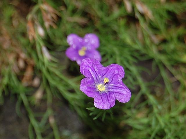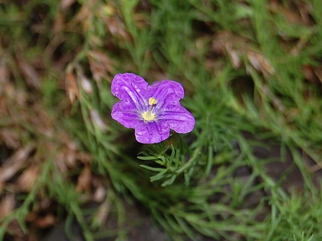 ニーレンベルギア・パープルローブ 秋の花 2014年09月15日 ニーレンベルギア・スコパリア(Nierembergia scoparia)はナス科アマモドキ属(ニーレンベルギア属)の多年草である。ニーレンベルギア属はメキシコから南アメリカにかけて35種が分布する。ニーレンベルギア・スコパリアは異名をニーレンベルギア・フルテスケンス(Nierembergia frutescens)という。このフルテスケンス種の和名を亜麻擬き(アマモドキ)といい、属名の和名もアマモドキ属という。また、和名の異名を亜麻騙し(アマダマシ)といい、属名の和名をアマダマシ属とするものもある。スコパリア種の原産地はブラジルからアルゼンチンにかけてである。草丈は40~80センチくらいある。直立し、茎の上部は箒状に枝分かれをする。ここで取り上げるパープルローブ(Purple Robe)はその園芸品種である。基本種の花の色は淡い紫色だが、写真のように濃い紫色になる点が異なる。葉は線状で、互い違いに生える(互生)。開花時期は6~9月くらいである。花径4~5センチの濃い紫色をした花を上向きにつける。花冠は筒状で、先が5つに裂けて横に広がり、皿のような形になる。花冠には皺が寄っている。花の真ん中は黄色い。花の後にできる実はさく果(熟すると下部が裂け、種子が散布される果実)である。属名の Nierembergia はスペインの植物学者「ニエレンベルグ(Johann Eusebius Nieremberg, 1595-1653)さん」の名からきている。種小名の scoparia は「箒状の」という意味である。園芸品種名の Purple Robe は「紫のローブ」という意味である。写真は9月に京都府立植物園で撮った。学名:Nierembergia scoparia 'Purple Robe'★いろいろな名前飛び交い騙される 手ごわいかもねニーレンベルギア花図鑑植物図鑑|味の麺匠戸田久|おこめの鬼平|フロム蔵王|花の本屋さん|楽天トラベル|