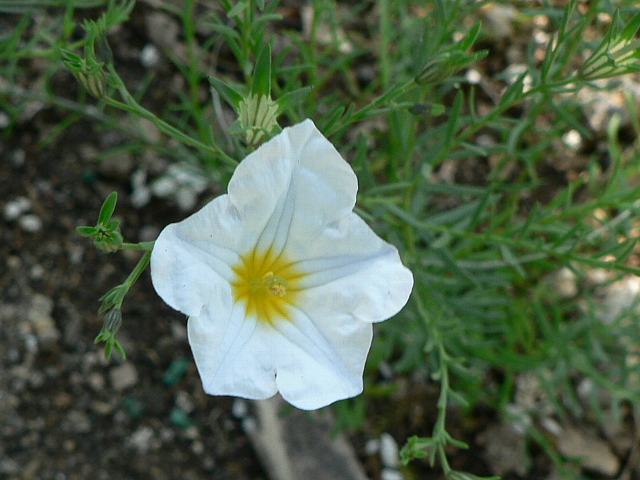 ニーレンベルギア・モンテブランコ 秋の花 2014年09月16日 ニーレンベルギア・ヒッポマニカはナス科アマモドキ属(ニーレンベルギア属)の多年草である。ニーレンベルギア属はメキシコから南アメリカにかけて35種が分布する。ニーレンベルギア・フルテスケンス(Nierembergia frutescens)の和名を亜麻擬き(アマモドキ)といい、属名の和名もアマモドキ属という。また、和名の異名を亜麻騙し(アマダマシ)といい、属名の和名をアマダマシ属とするものもある。ニーレンベルギア・ヒッポマニカの原産地はアルゼンチンである。モンテブランコ(Monte Blanco)はその園芸品種である。原種の花の色は紫色だが、本種の場合は白い。草丈は15~30センチくらいある。葉は線状で、互い違いに生える(互生)。開花時期は5~9月くらいである。花径2センチくらいの紫色をした花を上向きにつける。花冠は筒状で、先が5つに裂けて横に広がり、皿のような形になる。花冠には皺が寄っている。花の真ん中は黄色い。花の後にできる実はさく果(熟すると下部が裂け、種子が散布される果実)である。属名の Nierembergia はスペインの植物学者「ニエレンベルグ(Johann Eusebius Nieremberg, 1595-1653)さん」の名からきている。種小名の hippomanica はギリシャ語の「hipp(馬)+manus(手)」からきている。園芸品種名の Monte Blanco はスペイン語で「白い山」という意味である。写真は4月に京都府立植物園で撮った。学名:Nierembergia hippomanica 'Monte Blanco'★真っ白な花の真ん中黄色くて 爽やかに咲くモンテブランコ花図鑑植物図鑑|味の麺匠戸田久|おこめの鬼平|フロム蔵王|花の本屋さん|楽天トラベル|