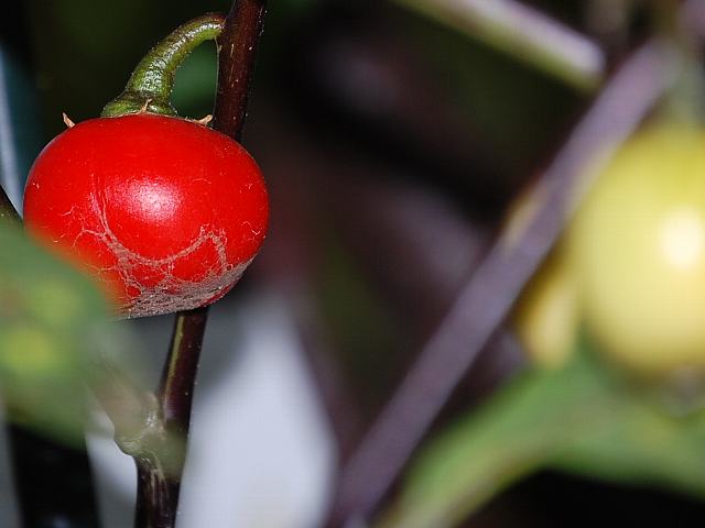 ソラヌム・センセーション 果実・野菜 2014年09月17日 茄子(ナス)はナス科ナス属の多年草である。原産地はインドである。日本へは奈良時代に中国経由で渡来した。温帯では一年生作物として栽培される。和名の由来には諸説があるが、夏にとれる野菜「夏の実」から「なすび」になったとする説が有力という。センセーション(Sensation)はその園芸品種で、観賞用として栽培される。花茄子(ハナナス)と呼ばれるものの1つで、花材として利用される。特徴は果実が球形で、色が淡い黄色から赤色へと変わることである。果実の直径は2センチくらいである。草丈は50センチから100センチくらいである。茎はよく枝分かれをして、小低木状となる。茎は黒紫色を帯び、短い毛が生える。葉は卵形で、互い違いに生える(互生)。葉の先は尖り、縁は浅く切れ込んで波打つ。開花時期は6月から11月くらいである。葉の脇に淡い紫色の花を下向きにつける。花の後にできる実は真果(子房と種子だけでできている果実)と呼ばれる。属名の Solanum はラテン語の「solamen(安静)」からきているという説がある。種小名の melongena は「ウリのなる」という意味である。写真は9月に京都府立植物園で撮った。学名:Solanum melongena 'Sensation'★色づけばまるで見事なミニトマト いろんな色に染まるものだね花図鑑植物図鑑|味の麺匠戸田久|おこめの鬼平|フロム蔵王|花の本屋さん|楽天トラベル|
