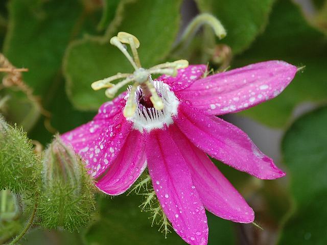 パッシフローラ・スブランケオラタ 秋の花 2014年09月20日 パッシフローラ・スブランケオラタはトケイソウ科トケイソウ属(パッシフローラ属)の蔓性常緑多年草である。パッシフローラ属は世界に500種くらいが分布する。また、多くの園芸品種が作出されている。同属のパッシフローラ・カエルレア(Passiflora caerulea)に時計草(トケイソウ)の和名があり、属名の和名をトケイソウ属という。本種の原産地は中南アメリカである。メキシコのタバスコ州やベリーズ、ベネズエラ、コロンビアなどに分布する。分類の仕方によって、パッシフローラ・パルメリの変種とするものと独立種とするものがある。草丈は2メートルから4メートルくらいである。茎や葉には柔らかな毛が生えている。葉は手のひら状に3つに裂け、互い違いに生える(互生)。開花時期は7月から9月くらいである。花径は7センチから8センチで、花の色はピンクである。萼片と花弁がそれぞれ5枚ずつあり、同じ色と形なので10枚の花びらがあるように見える。副花冠が水平に放射状に開き、時計の文字盤のように見える。花は早朝に開花し、午前中には閉じる。花の後にできる実は長さ5センチくらいの楕円形の液果(果皮が肉質で液汁が多い実)で、食用になる。属名の Passiflora はラテン語の「flor della passione(情熱の花)」からきている。雌しべの柱頭をはりつけにされたキリストにたとえ、放射状の副花冠をキリストの後光にたとえた。種小名の palmeri はイギリス生まれの植物学者「パーマー(Edward Palmer, 1829-1911)さんの」という意味である。変種名の sublanceolata は「やや披針形の」という意味である。写真は9月に京都府立植物園で撮った。学名:Passiflora palmeri var. sublanceolata(syn. Passiflora sublanceolata)★めずらしいピンクが可愛い時計草 柔らかな毛に覆われて咲く花図鑑植物図鑑|味の麺匠戸田久|おこめの鬼平|フロム蔵王|花の本屋さん|楽天トラベル|