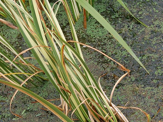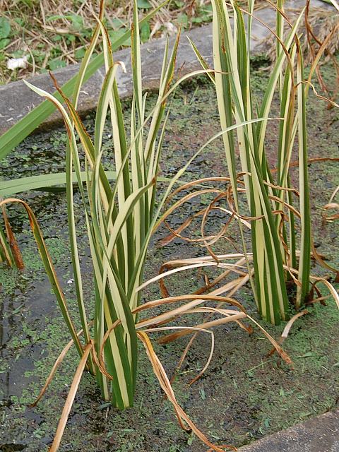 斑入り菖蒲(フイリショウブ) 観葉植物 2014年09月25日 菖蒲(ショウブ)はサトイモ科ショウブ属の多年草である。分類体系によっては(APGIII)ショウブ科とされる。ショウブ属は世界に5~6種が分布する。菖蒲(ショウブ)は北海道から九州にかけて分布し、水辺に生える。海外では北半球に広く分布する。中国では古来から男子にとって縁起の良い植物とされてきた。日本でも端午の節句に使われ、また香りのよい根茎を入れて菖蒲湯とされる。斑入り菖蒲(フイリショウブ)はその園芸品種である。特徴は葉に縦縞の白い斑が入ることである。草丈は50~100センチくらいである。根茎は枝分かれをして横に這う。葉は剣形で中脈が目立つ。開花時期は5~7月くらいである。花茎の先に淡い黄緑色をした肉穂花序(花軸が多肉化して花が表面に密生したもの)をつける。花の後にできる実は液果(果皮が肉質で液汁が多い実)の集合果である。属名の Acorus はギリシャ語の「a(否定)+coros(装飾)」からきている。花が地味なことから名づけられた。種小名の calamus は「管の」という意味である。園芸品種名の Variegatus は「斑入りの」という意味である。写真は9月に大阪市大植物園で撮った。学名:Acorus calamus 'Variegatus'★斑入り葉はいろいろあるが菖蒲にも 頷きながら葉っぱに触れて花図鑑植物図鑑|味の麺匠戸田久|おこめの鬼平|フロム蔵王|花の本屋さん|楽天トラベル|PR