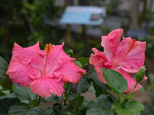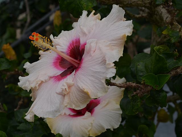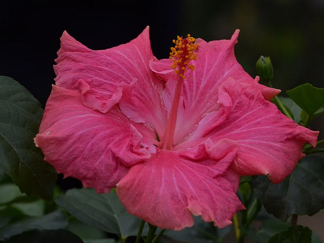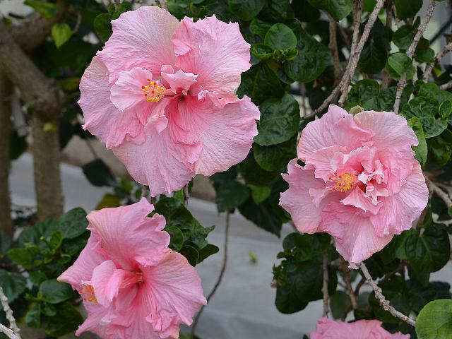 カール E. ジュニア 四季咲きの花 2014年08月17日 ハイビスカスはアオイ科フヨウ属の植物の総称である。多くの園芸品種が生まれているが、主にオールド系、ハワイアン系、コーラル系の3系統に分類されている。カール E. ジュニア(Carl E. Junior)は、ハワイアン系に属する。ハワイアン系はハワイで交配された大輪種で、鑑賞価値が高く数も多い。樹高は1メートルから2メートルである。葉は楕円形で、互い違いに生える(互生)。葉の先は尖り、縁には粗いぎざぎざ(鋸歯)がある。開花時期は周年である。半八重咲きの大輪である。花の色はピンクで、表面には皺があり、縁は波打つ。雄しべの一部が花弁化している。花柱は淡い紅色、柱頭は濃い紅色である。属名の Hibiscus はギリシャ語由来で「Hibis(エジプトの女神)」の名からきているとの説があり、大形のゼニアオイ属につけられた名である。写真は4月に大阪市の咲くやこの花館で撮った。学名:Hibiscus 'Carl E. Junior'★おやこれはハイビスカスにも八重咲きが それはプロだが凄ワザだよね花図鑑植物図鑑|味の麺匠戸田久|おこめの鬼平|フロム蔵王|花の本屋さん|楽天トラベル|